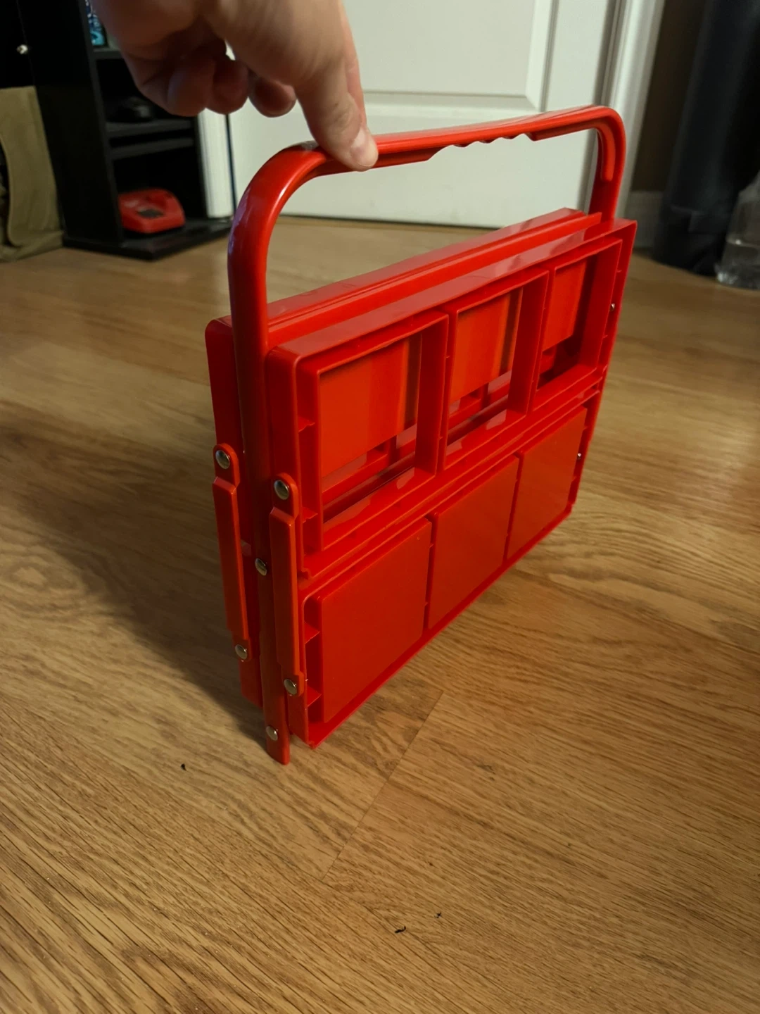 This is a collapsible red plastic caddy organizer. It features multiple (6) compartments for storage of jars or bottles and a handle for easy carrying. It's made of durable plastic.