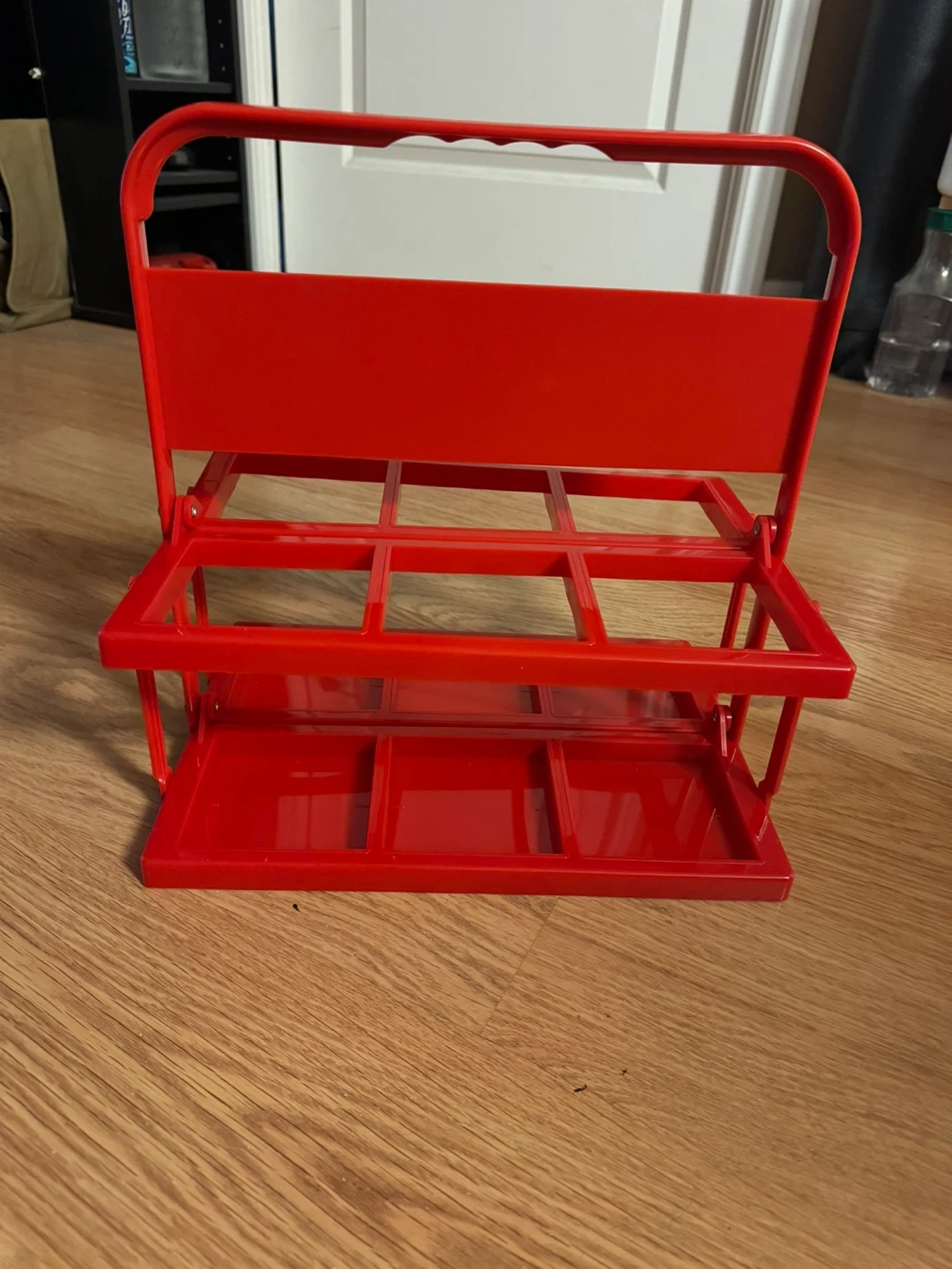 This is a collapsible red plastic caddy organizer. It features multiple (6) compartments for storage of jars or bottles and a handle for easy carrying. It's made of durable plastic.