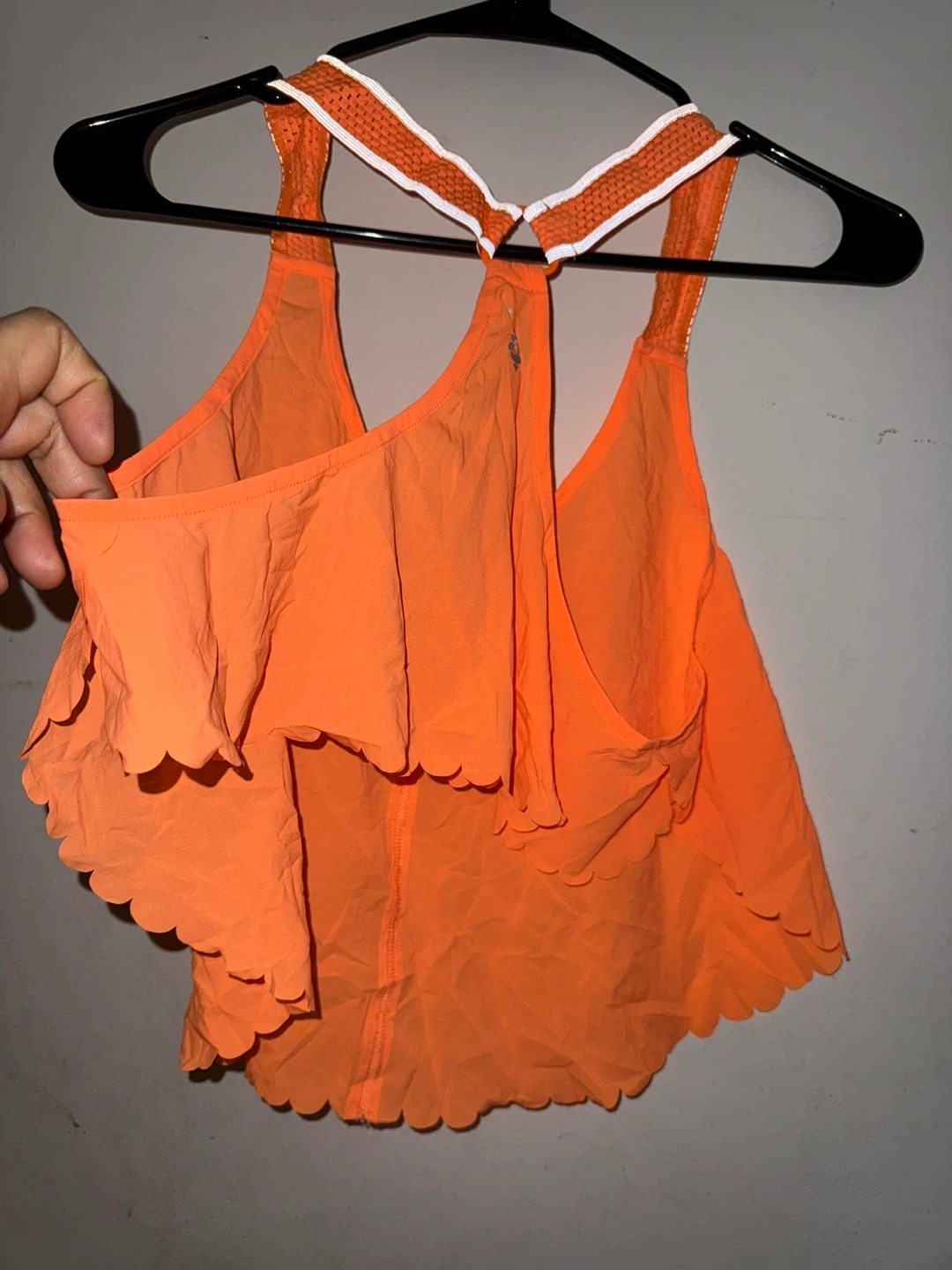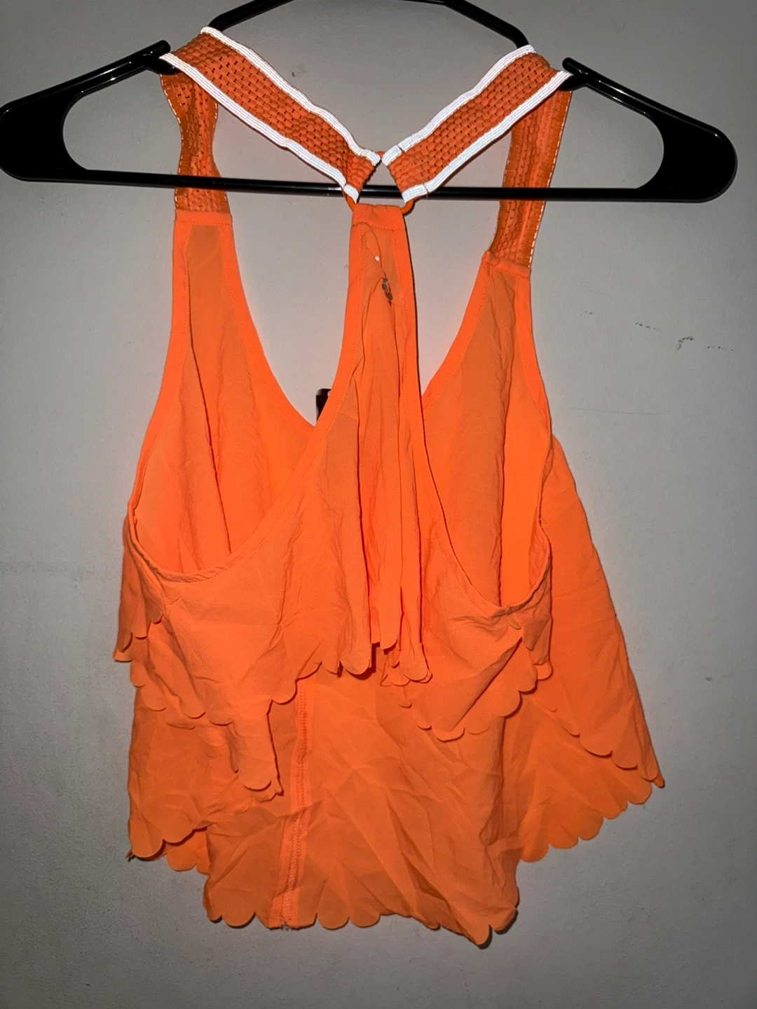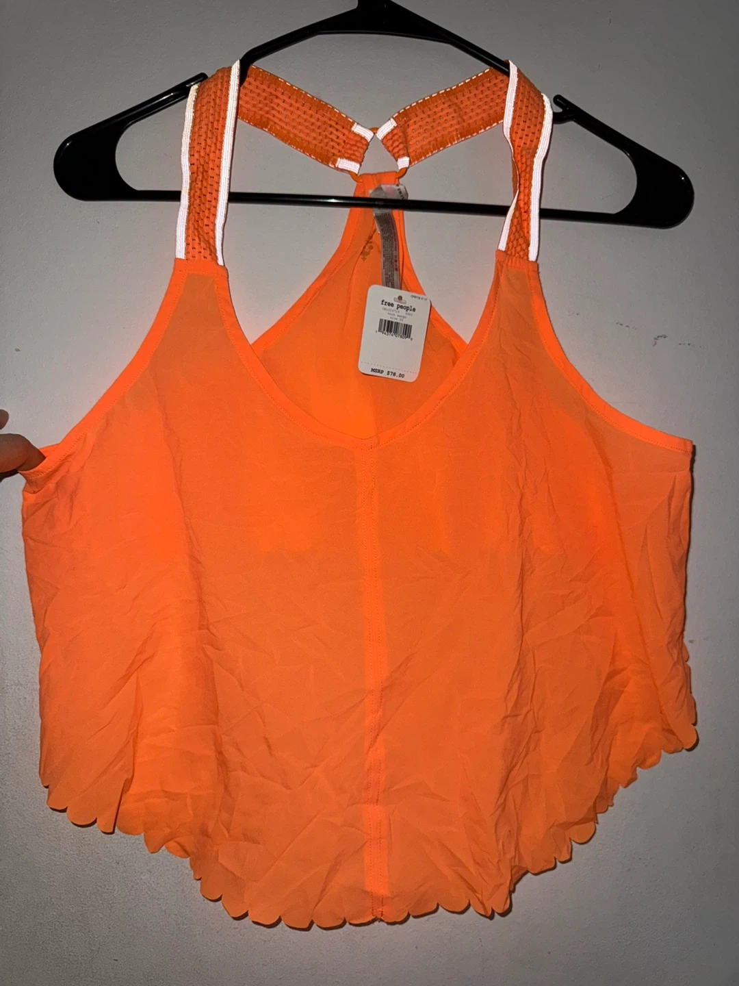 Selling a Free People top in a vibrant neon mango colour. It's a size XS and has a unique design. The original price was $78.00!