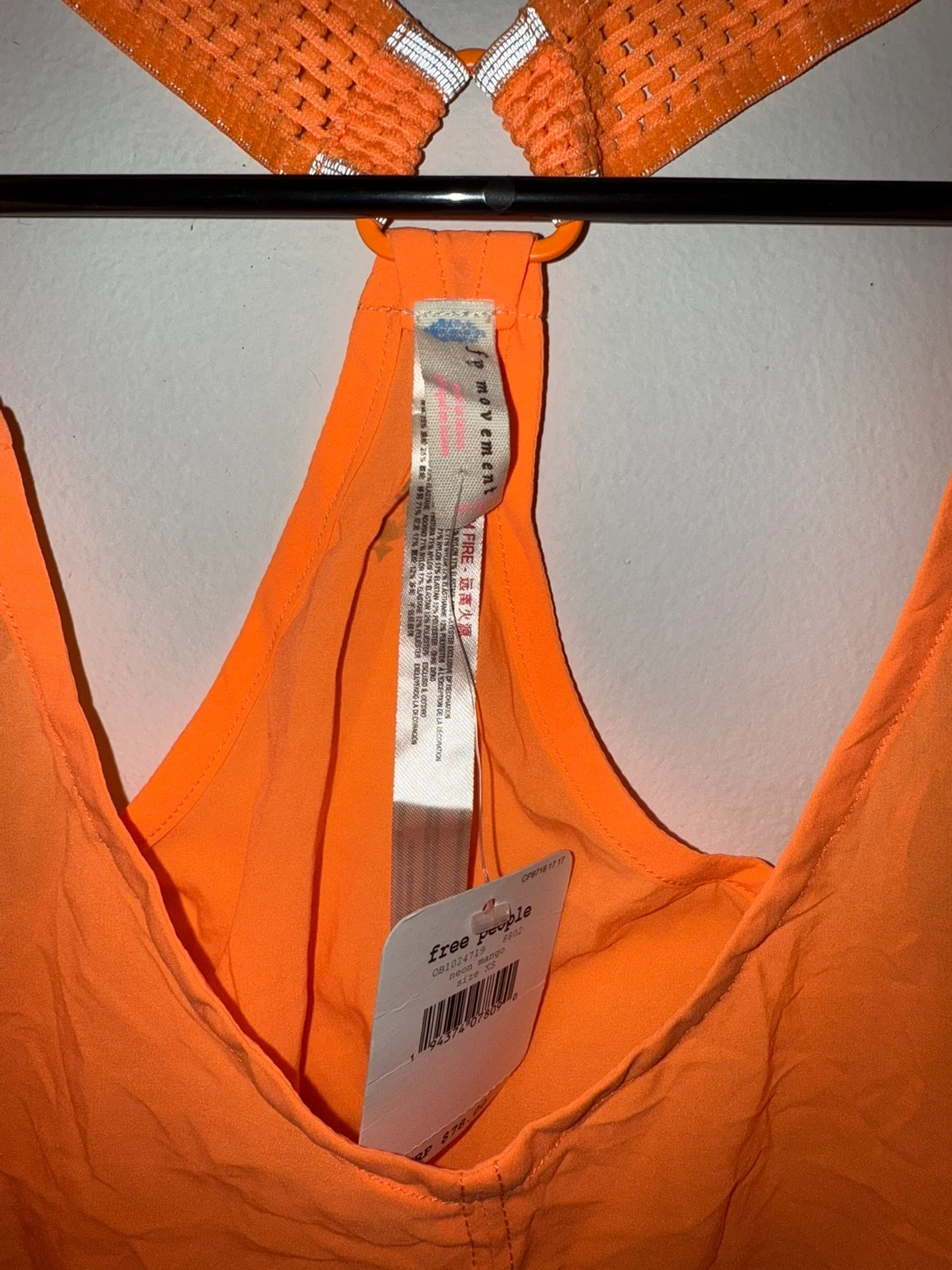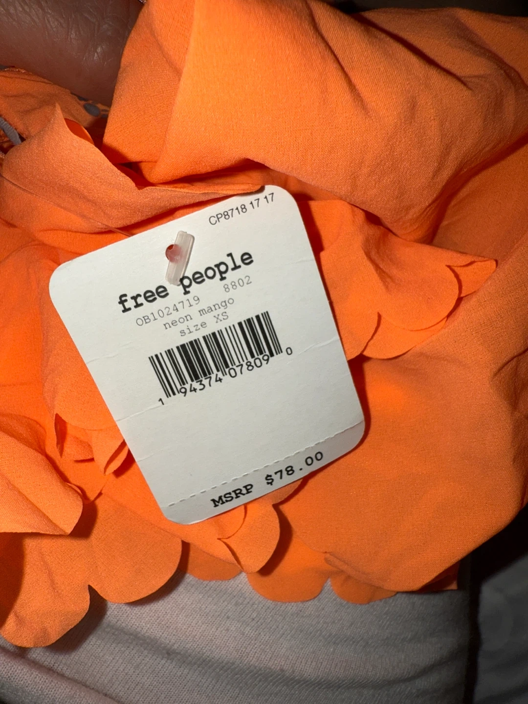 Selling a Free People top in a vibrant neon mango colour. It's a size XS and has a unique design. The original price was $78.00!