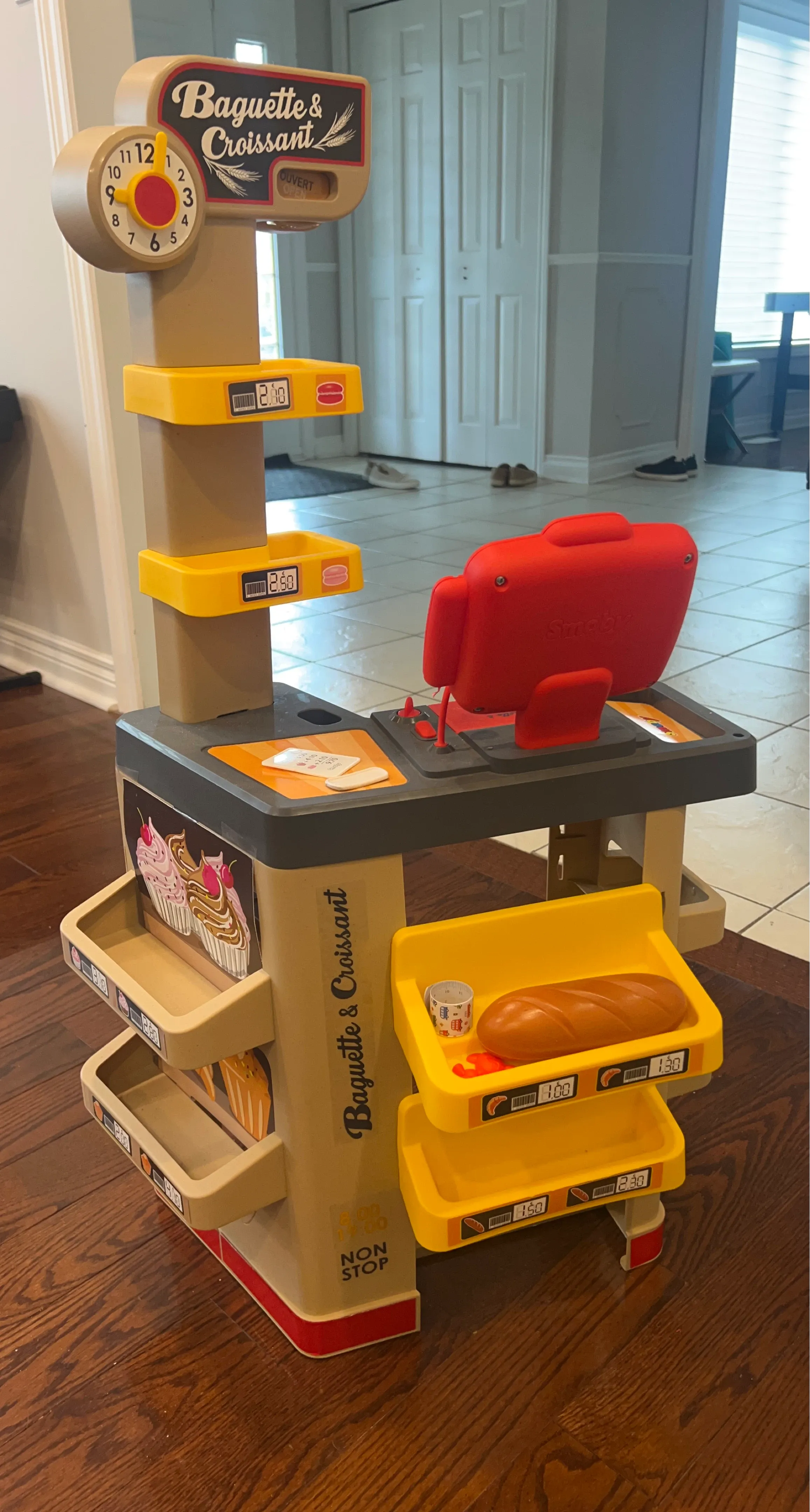 This Smoby bakery stand is ready for playtime adventures! It includes a cash register, shelves, and play food like a baguette and cupcakes. It's designed for kids to enjoy imaginative role-playing as bakers or shopkeepers.