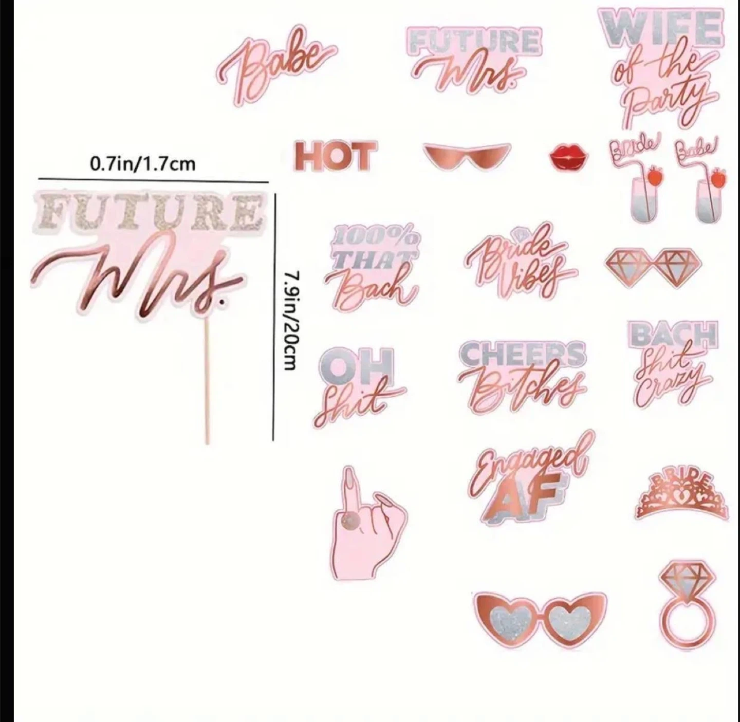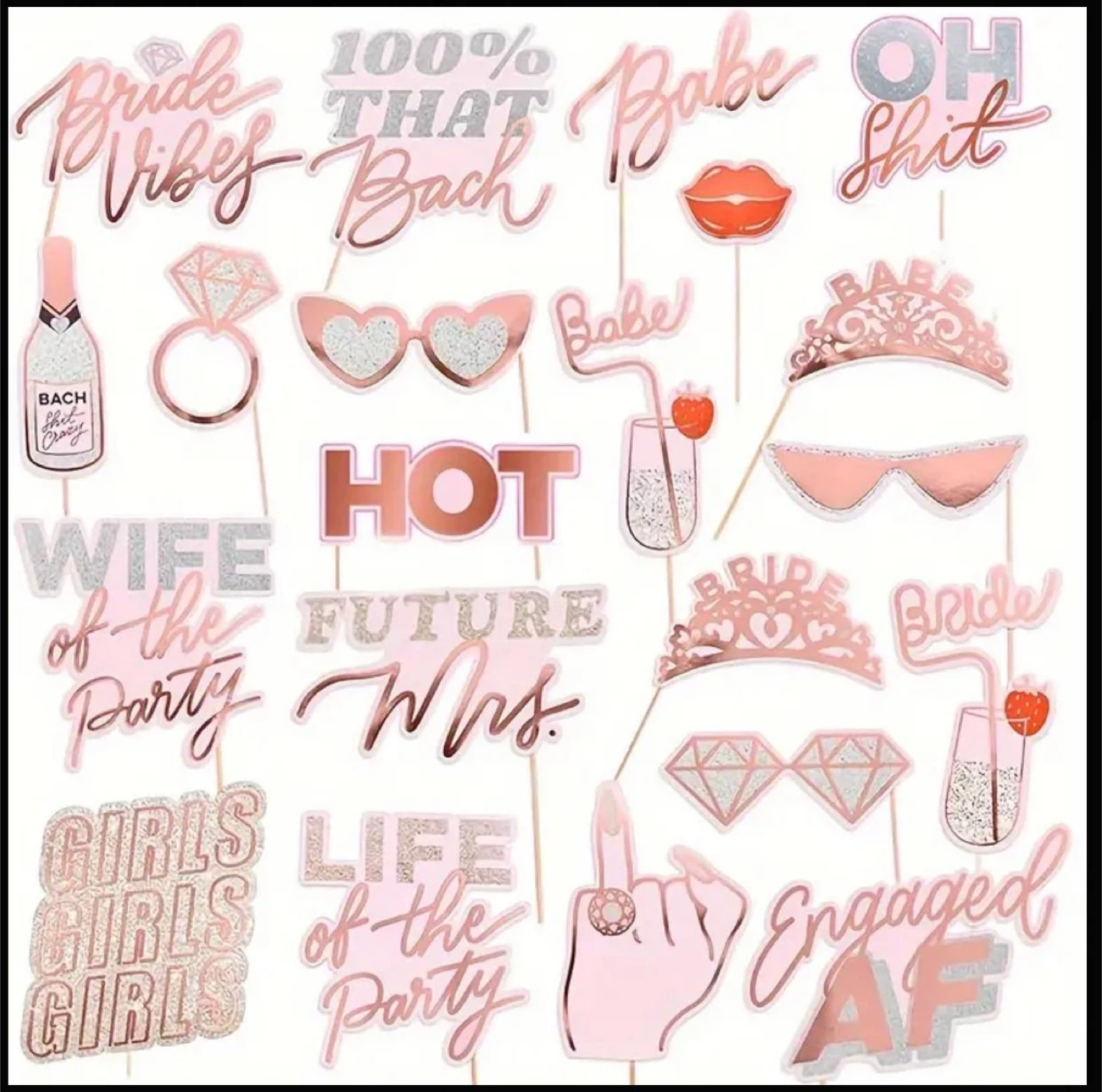Set of fun and festive bachelorette party photo booth props. Features rose gold foil and glitter accents. Perfect for engagement parties, bridal showers, or bachelorette celebrations. Includes various phrases and designs.