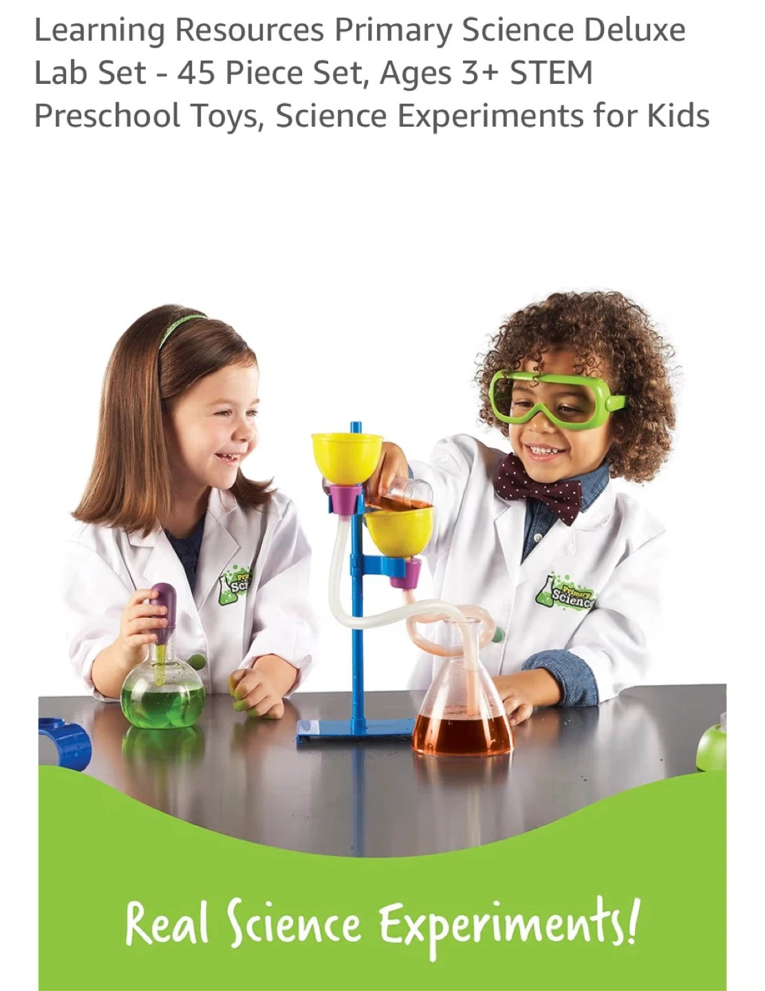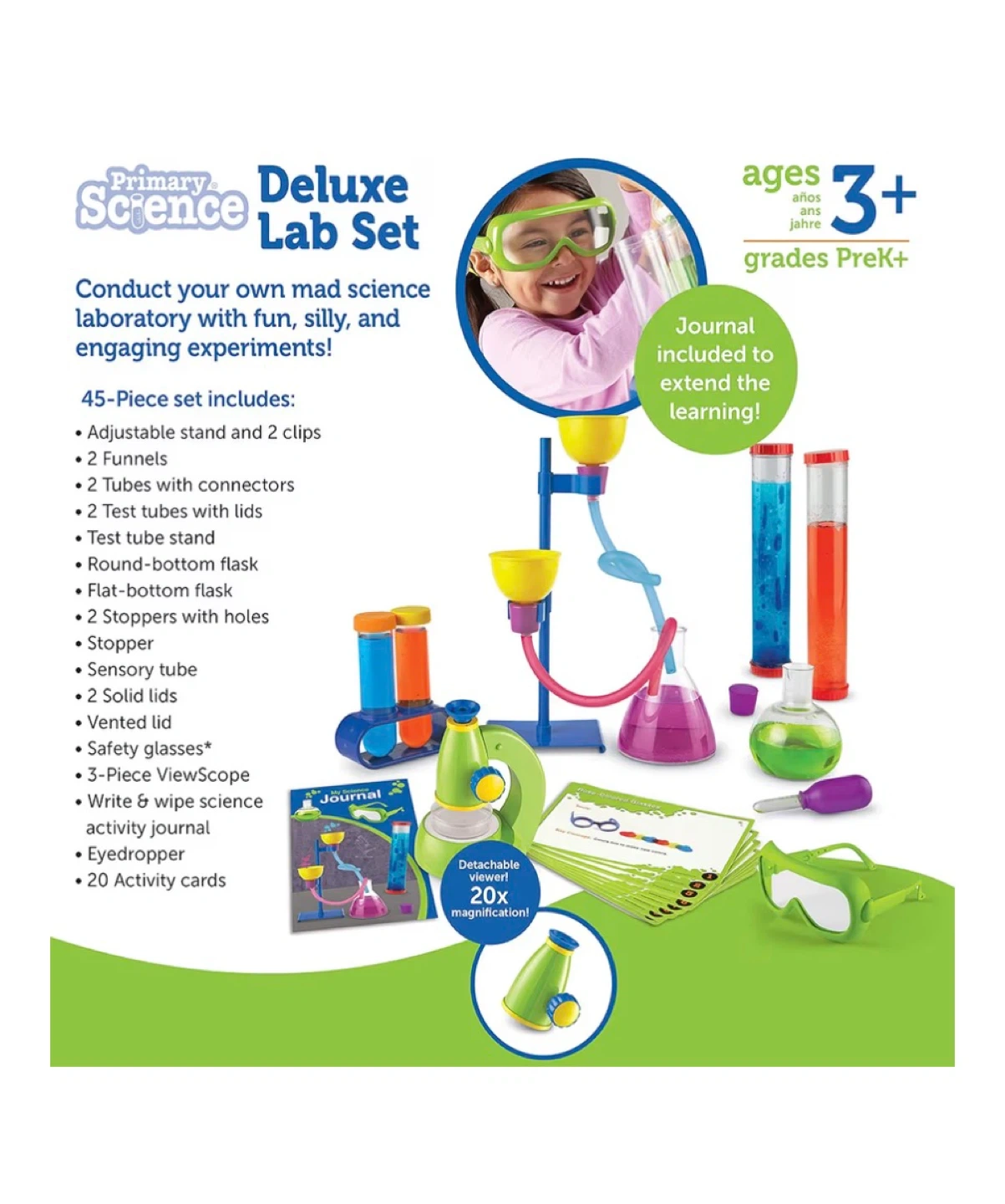 This 45-piece science lab set is designed for kids ages 3 and up. It includes a stand, funnels, tubes, beakers, safety glasses, a journal, and 20 activity cards. It's great for encouraging early STEM learning through hands-on experiments!