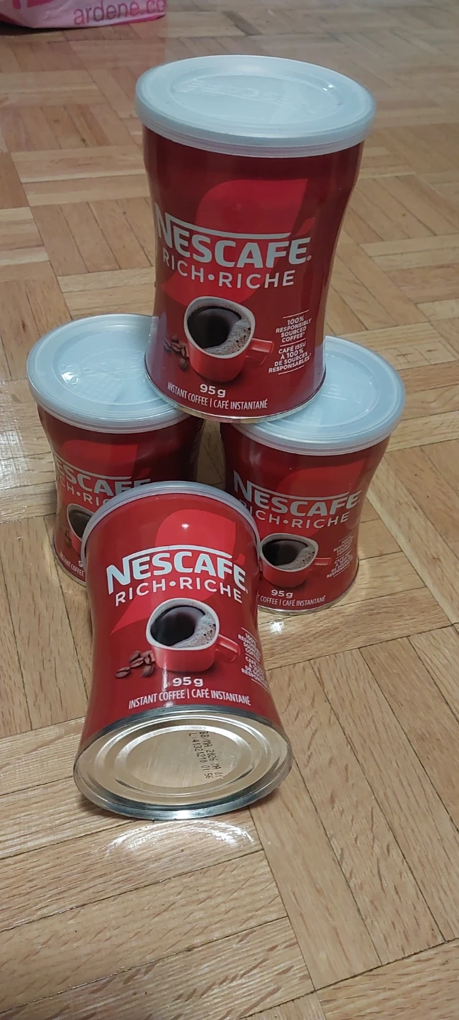 Nescafé Rich & Rich instant coffee in 95g cans. It's made from 100% responsibly sourced coffee beans. Best before date is March 2026.