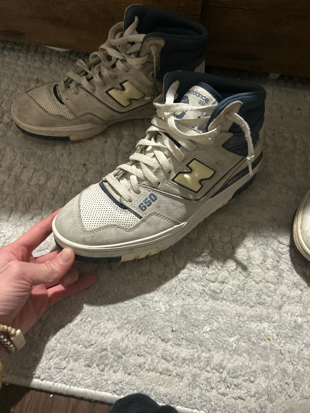 New Balance BB650R high-top sneakers in white and navy. Features a suede and mesh upper with "650" detailing. Size 9.5 USW (UK 9, EU 43, 27.5 CM). Made in Vietnam.