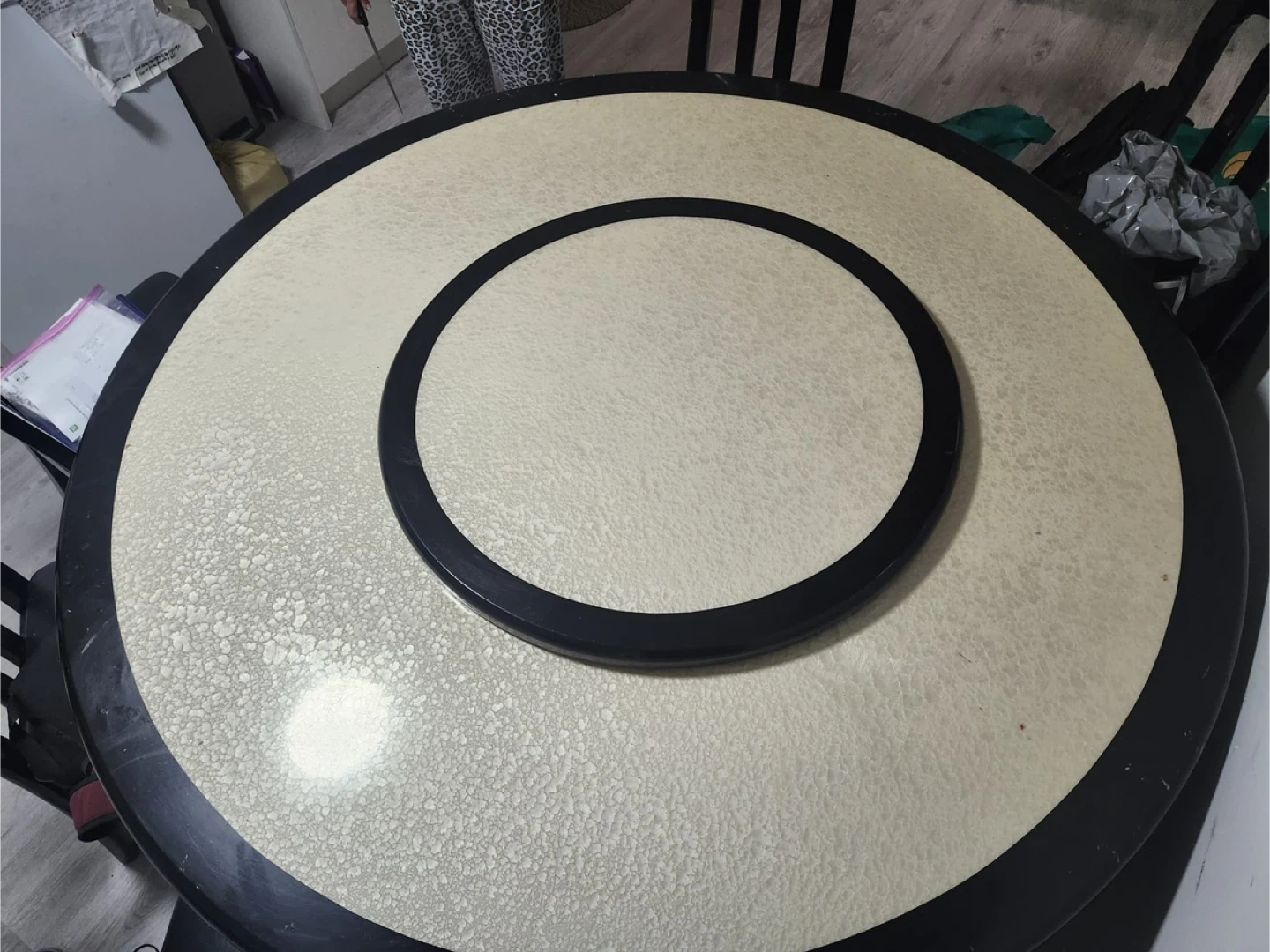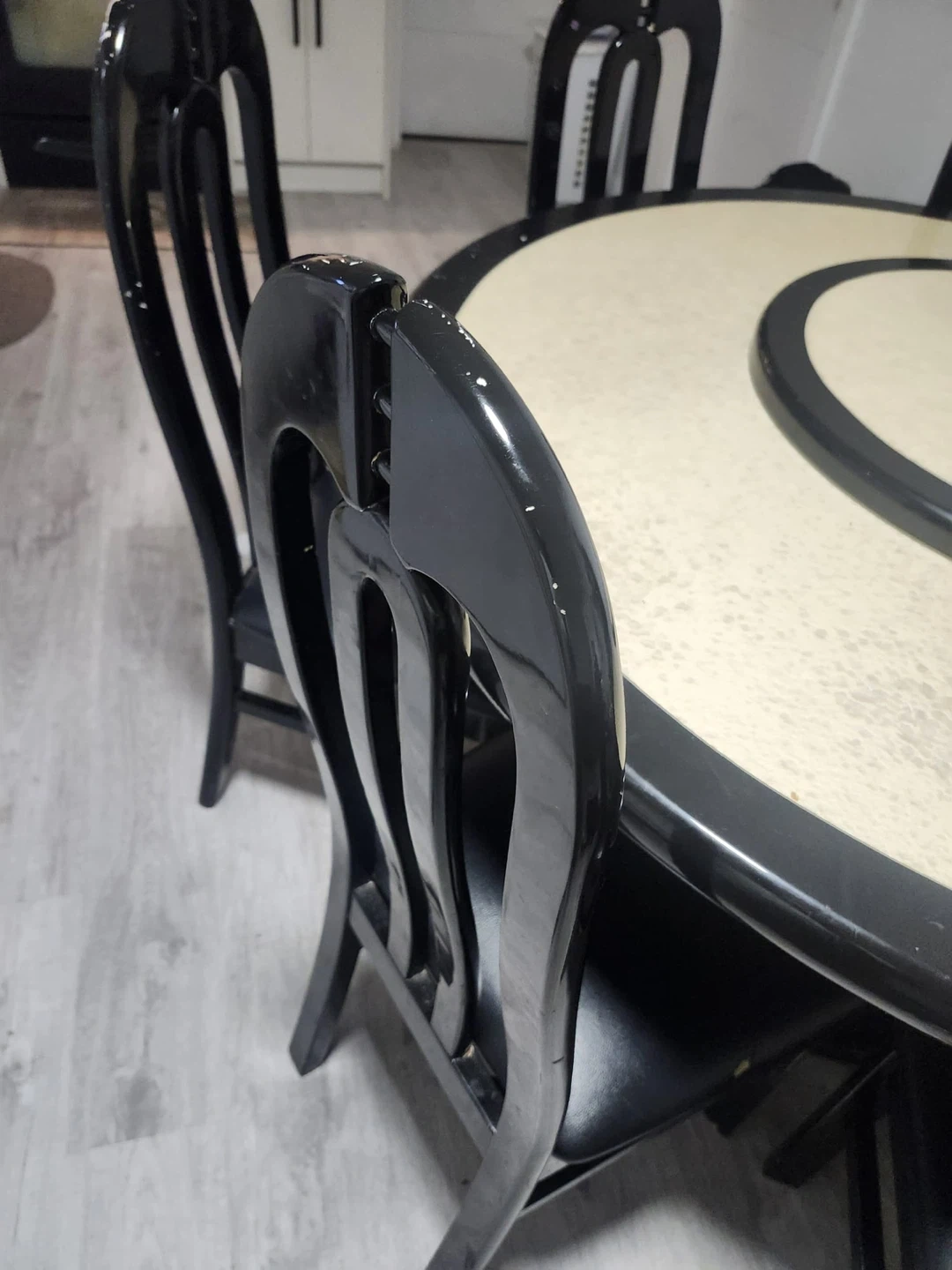 A six-seater dining set with an oval table and six black chairs. The table has a light-coloured textured insert and a black trim. Chairs are upholstered in black. It's perfect for family meals!