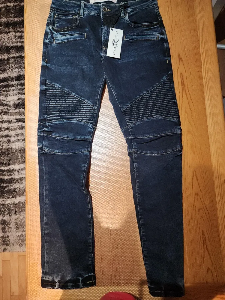 Selling a pair of Paracco moto-style jeans in a dark wash. They have a unique design with ribbed detailing on the thighs and knees. These jeans are BNWT