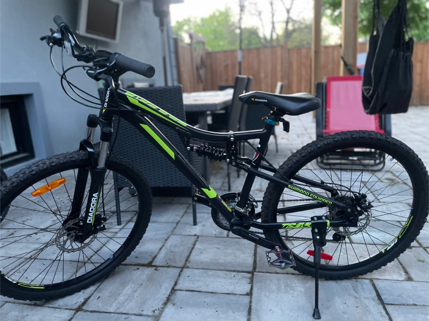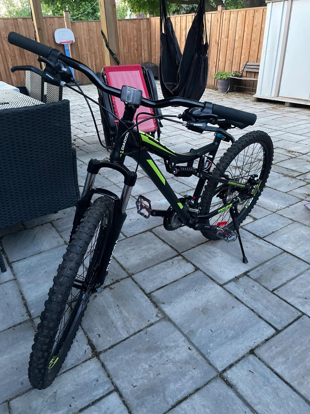 Here is a mountain bike with front and rear suspension. It features disc brakes, and tires with good tread. Perfect for a relaxing weekend ride, exploring trails or cruising around the neighbourhood. Almost brand new.