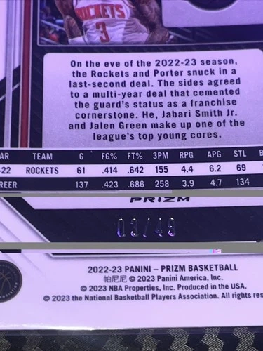 2022-23 Panini Prizm #175 Kevin Porter Jr. Prizms Orange #03/49. Tyrese Haliburton 2022-23 Panini Select Concourse Orange Flash Prizm #20 Pacers. Let me know if you're interested!
