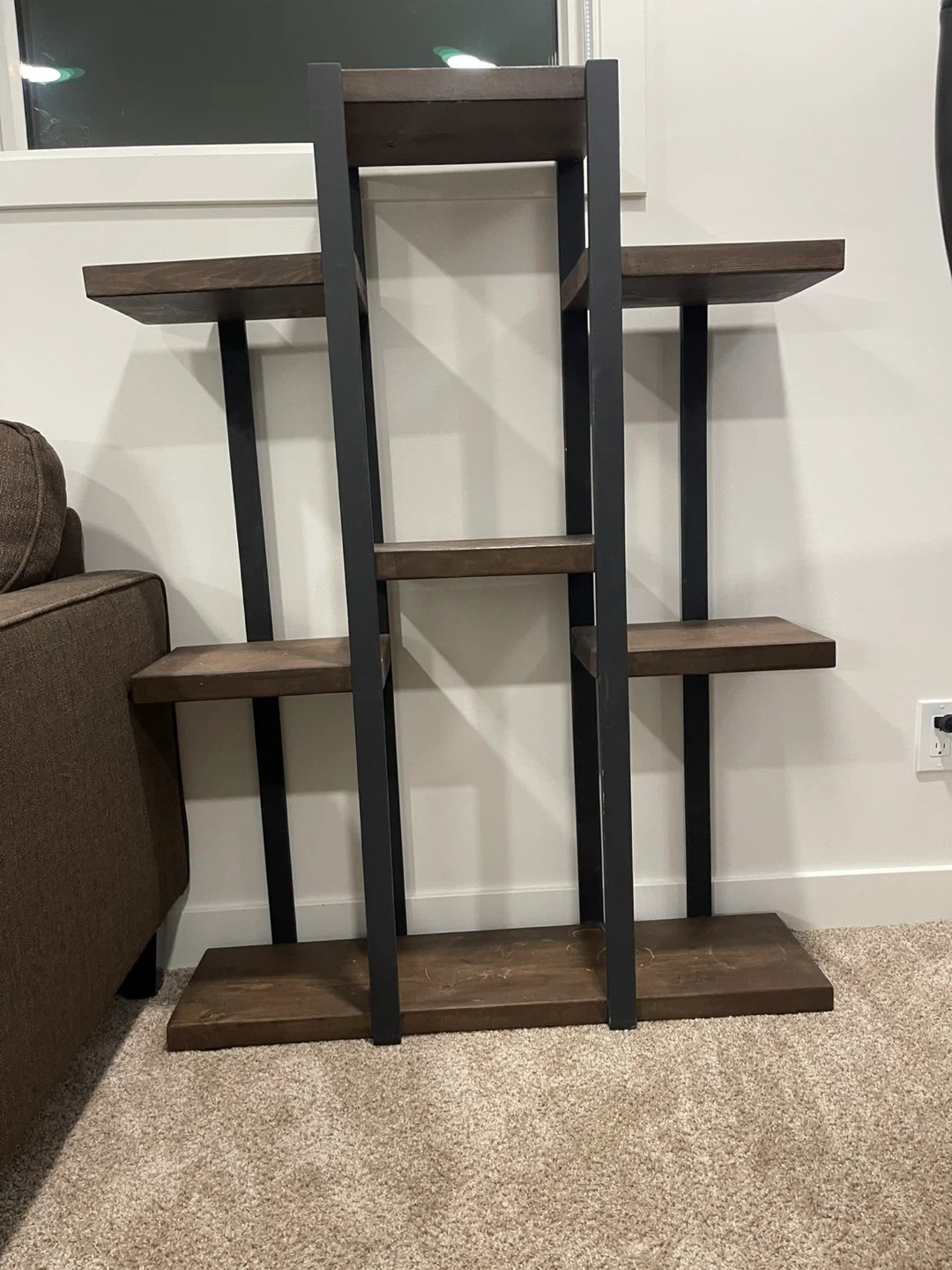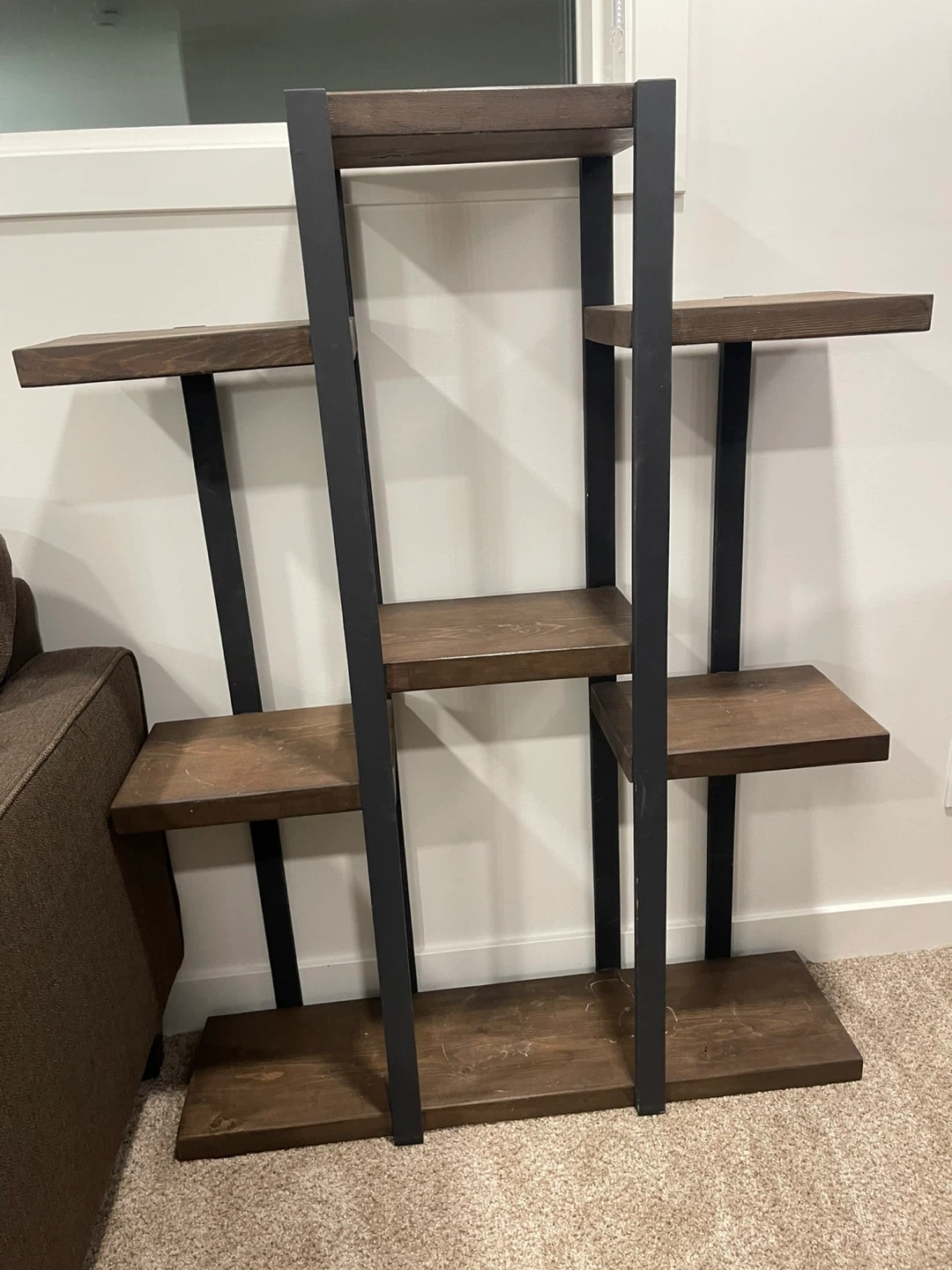 Selling a wooden plant stand/shelf. It has a dark wood finish with black metal supports. Great for displaying plants or other decorative items!