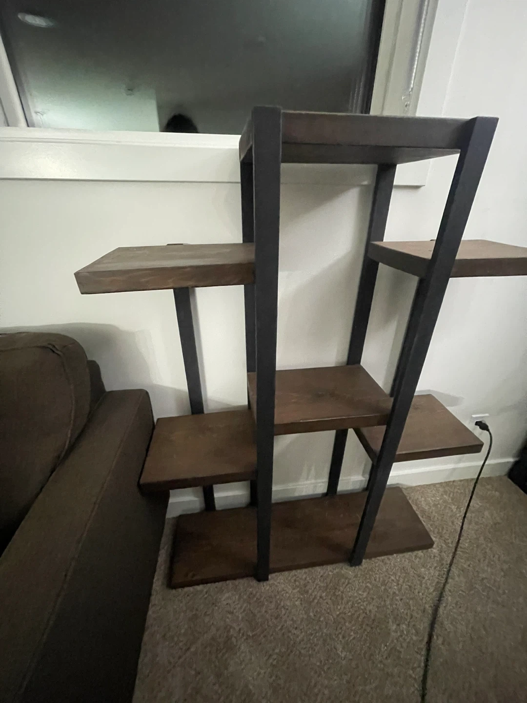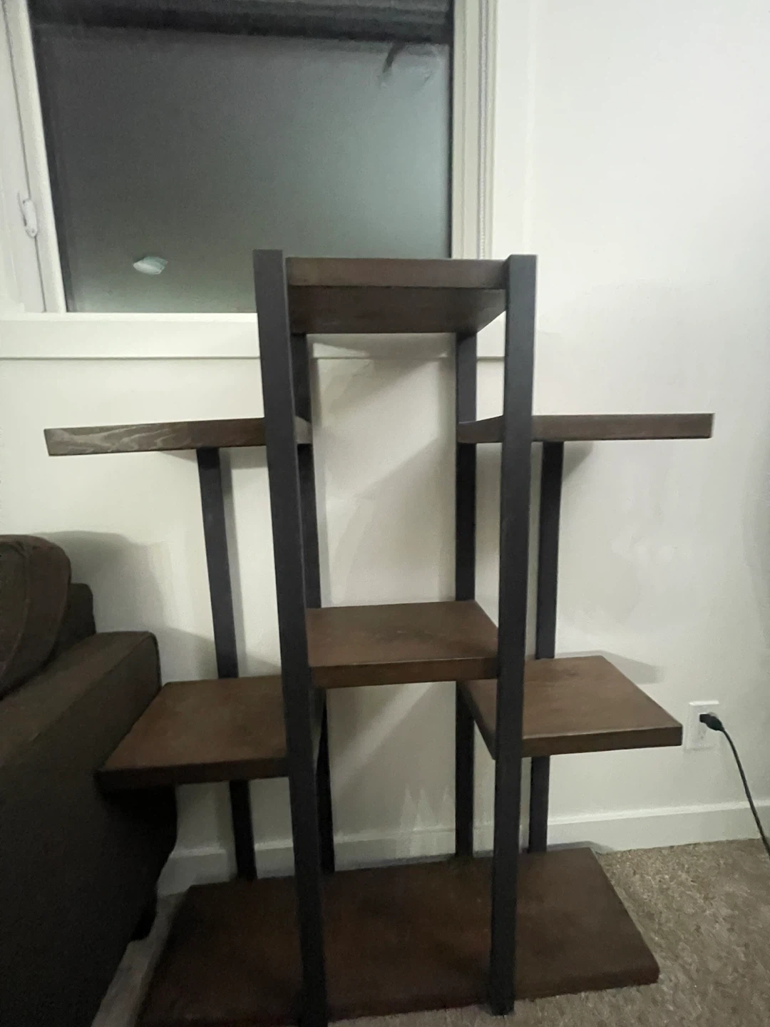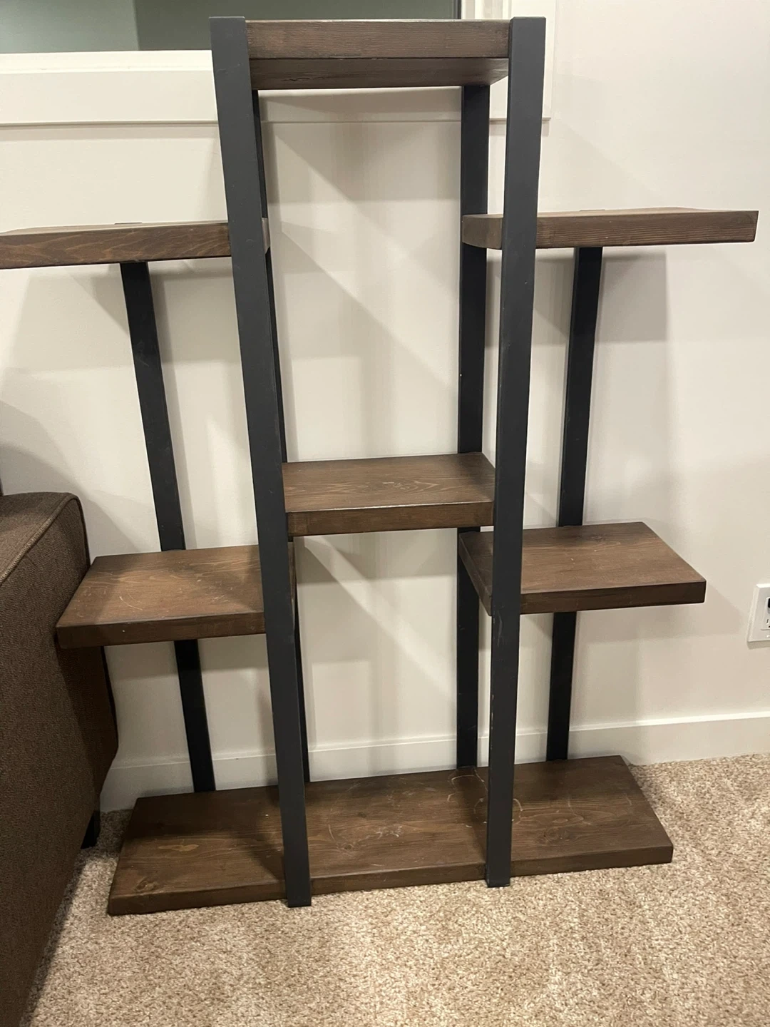 Selling a wooden plant stand/shelf. It has a dark wood finish with black metal supports. Great for displaying plants or other decorative items!