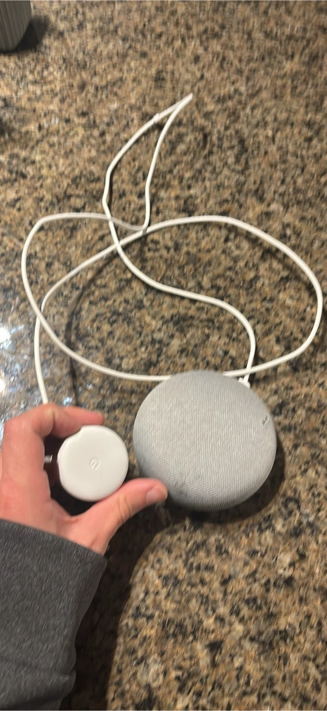This is a Google Nest Mini smart speaker in the 2nd generation. It's a compact, grey fabric smart speaker with voice control. Comes with its power adapter.