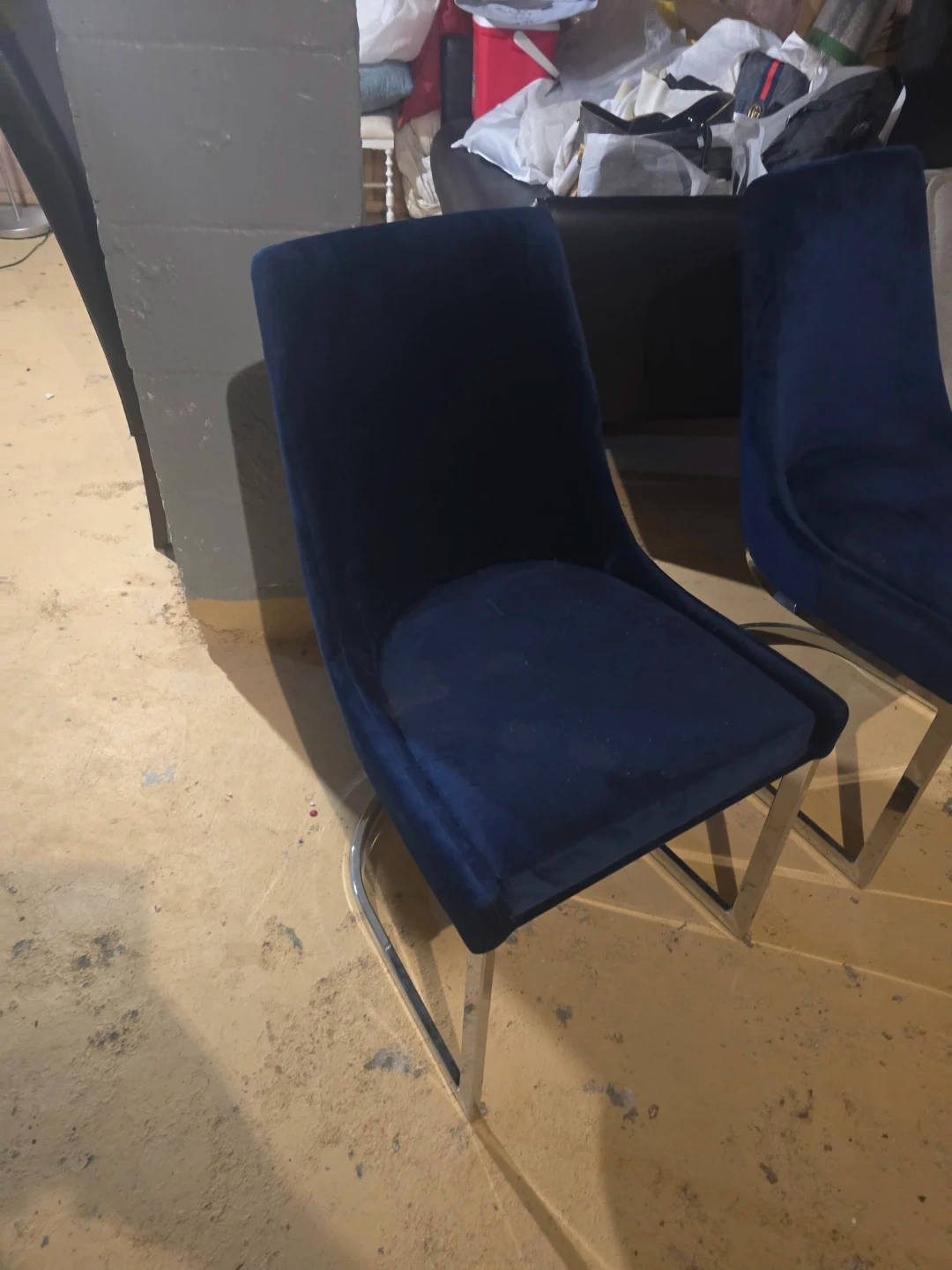 Selling a pair of stylish dining chairs! They feature a rich blue velvet upholstery and sleek chrome legs. They would look great in any dining room or kitchen space