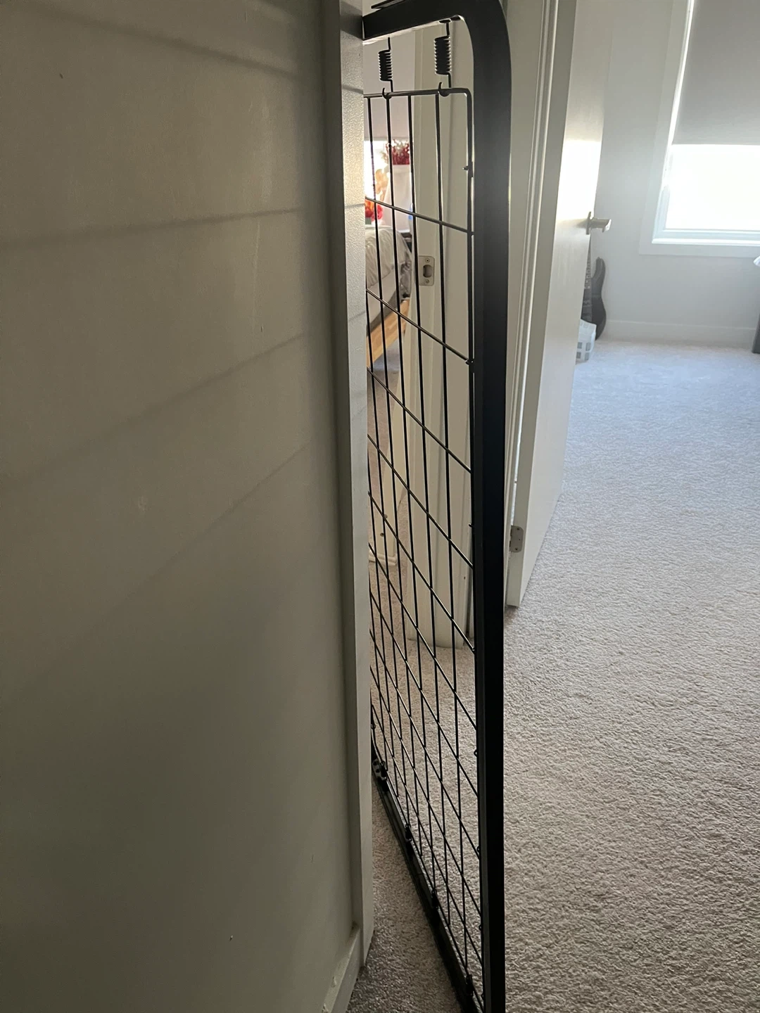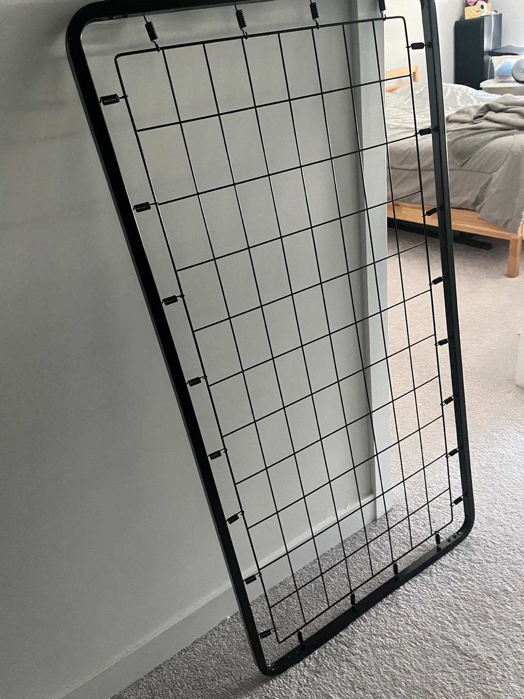 This is a black metal bed frame base for a crib. . It's a wire grid design with a sturdy metal frame and spring supports. It's suitable for supporting a mattress directly.
