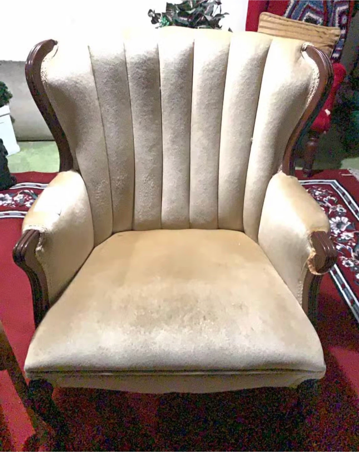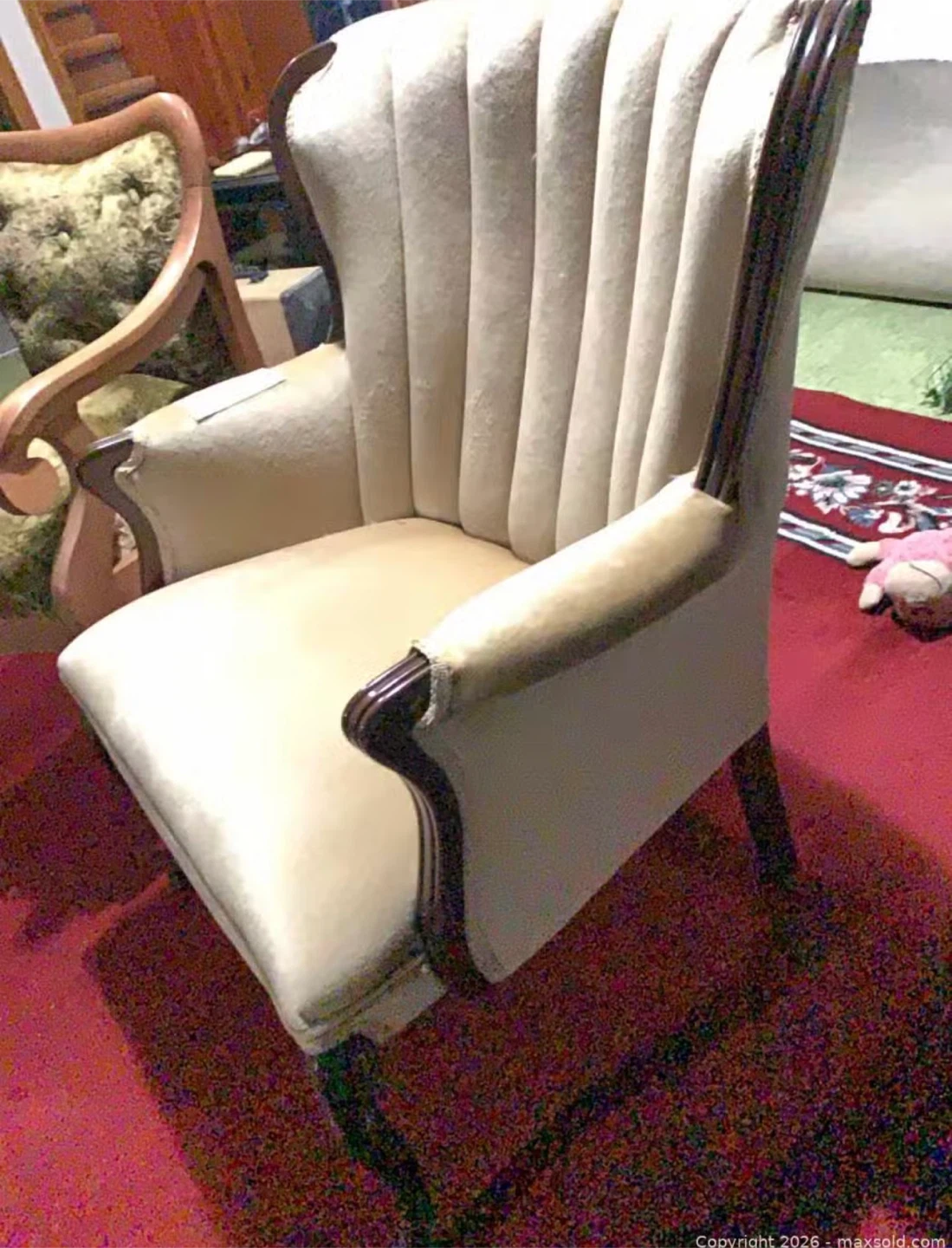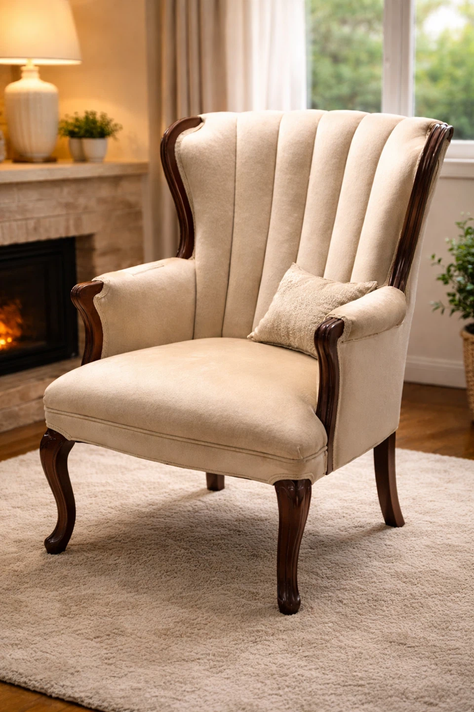 Comfortable wingback armchair with a classic design. Perfect for adding a touch of elegance to any room. The chair features a beige upholstery and dark wood trim. A small matching pillow is included.
