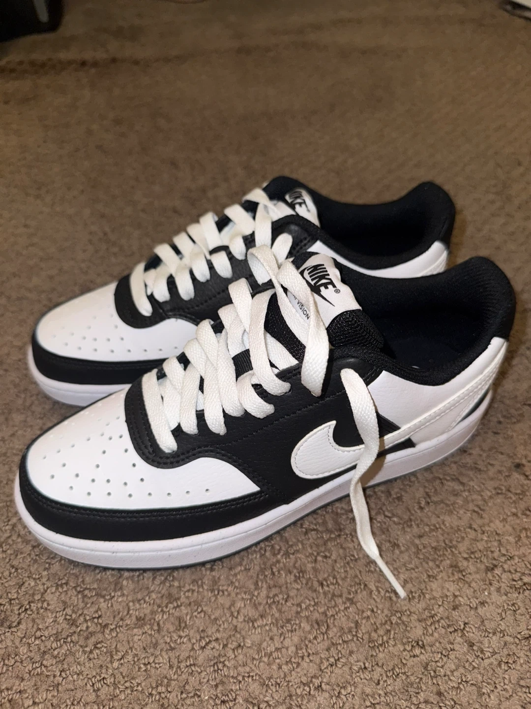 These Nike Court Vision Low sneakers are a classic black and white colourway. They feature a durable rubber sole and comfortable cushioning. Perfect for everyday wear or hitting the court!