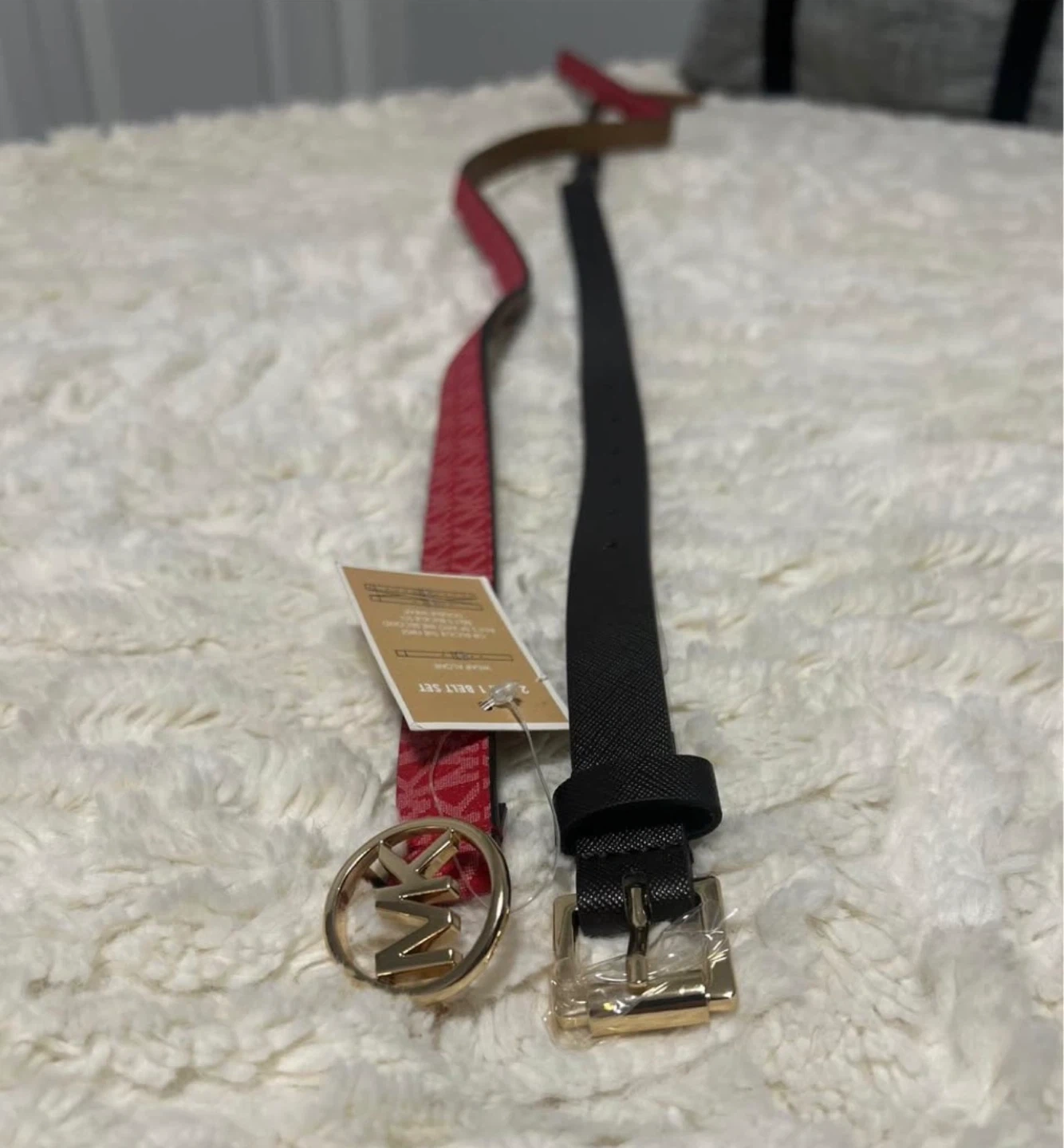 Two Michael Kors belts, one brown and one pink with MK monogram pattern. Both come with gold-tone hardware. This set offers versatile styling options for any outfit!