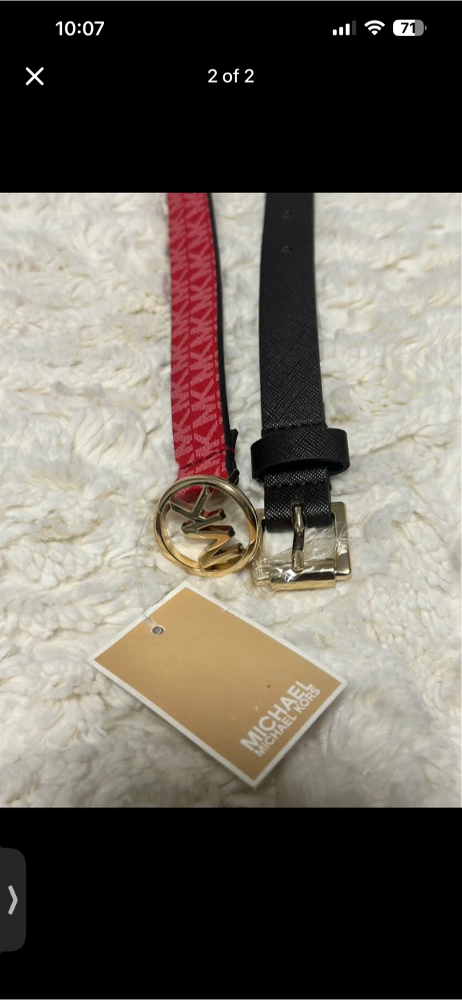 Two Michael Kors belts, one brown and one pink with MK monogram pattern. Both come with gold-tone hardware. This set offers versatile styling options for any outfit!