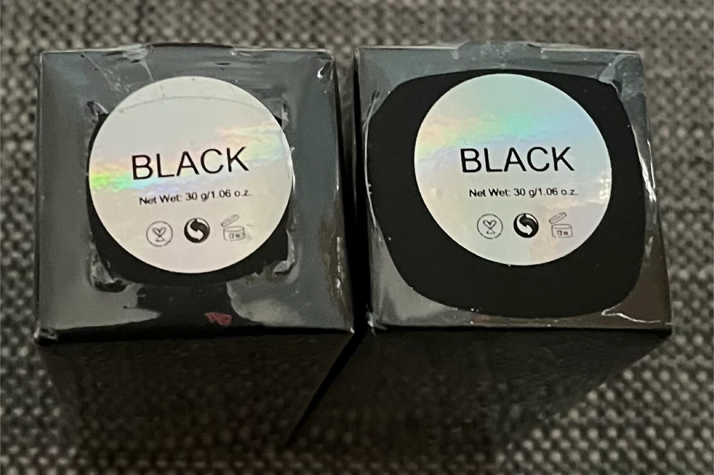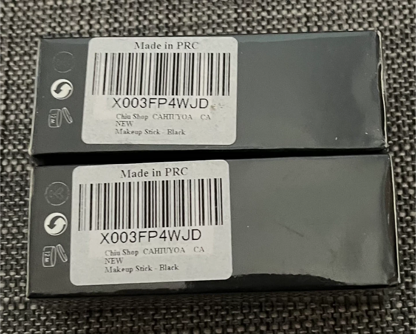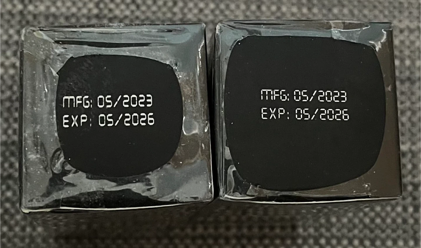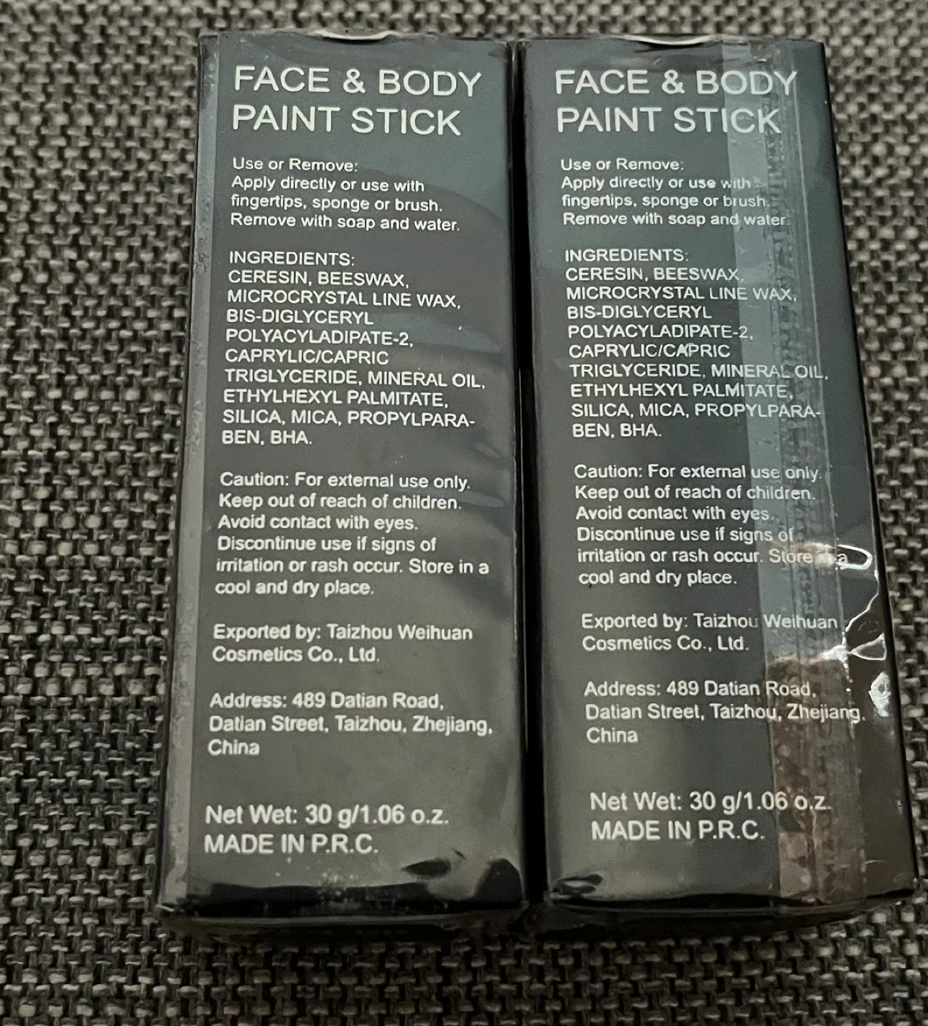 Two FACE & BODY PAINT STICKs in black. Each is 30 g/1.06 oz. Manufactured in May 2023, expires May 2026. Ingredients include ceresin, beeswax, and mineral oil.