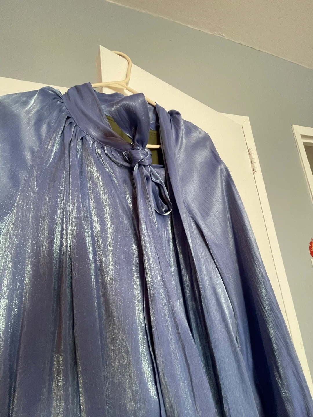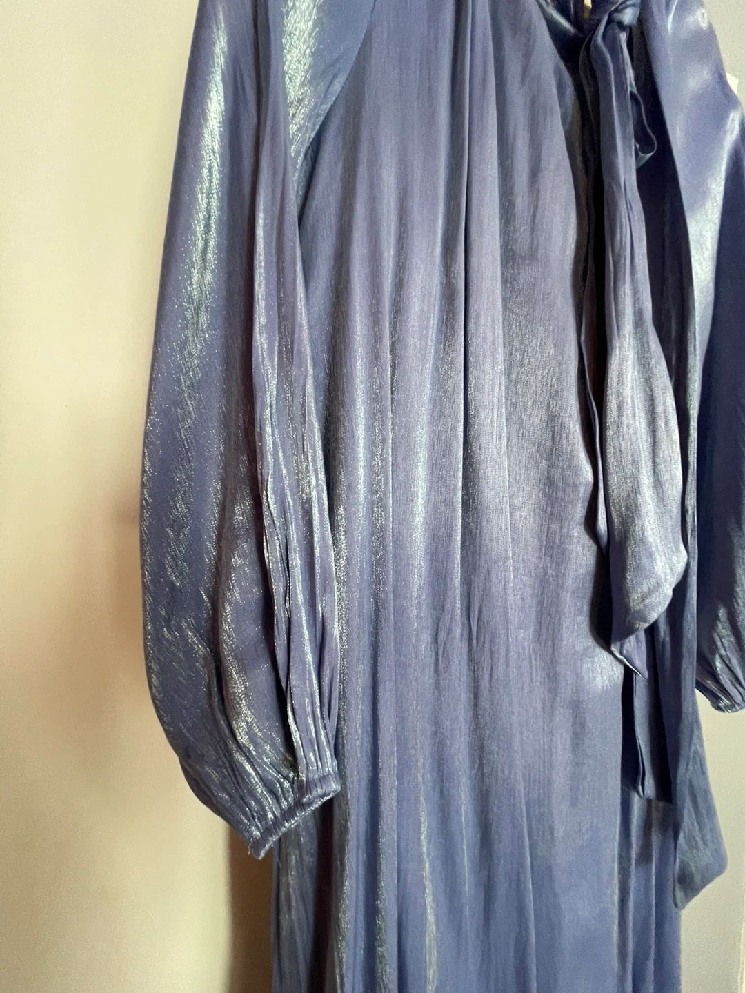This is a long blue dress with metallic It has long, voluminous sleeves and a tie detail at the neck. The dress falls to the floor. It's made of a shimmery fabric.