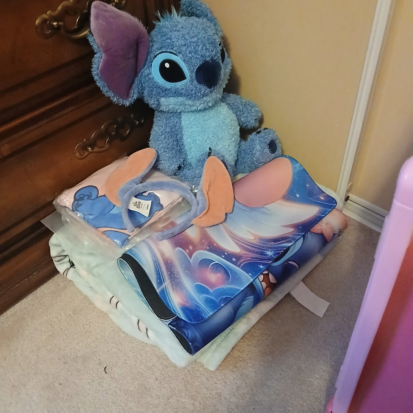 Selling a cute Disney Lilo & Stitch set! Includes a soft blanket, a weighted stitch plushie and a fun headband. and a couple other stitch beding in packaging Perfect for any Stitch fan!