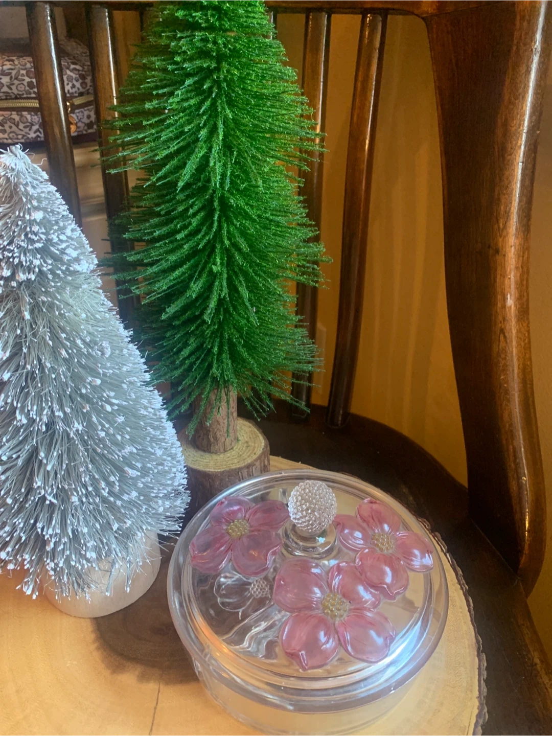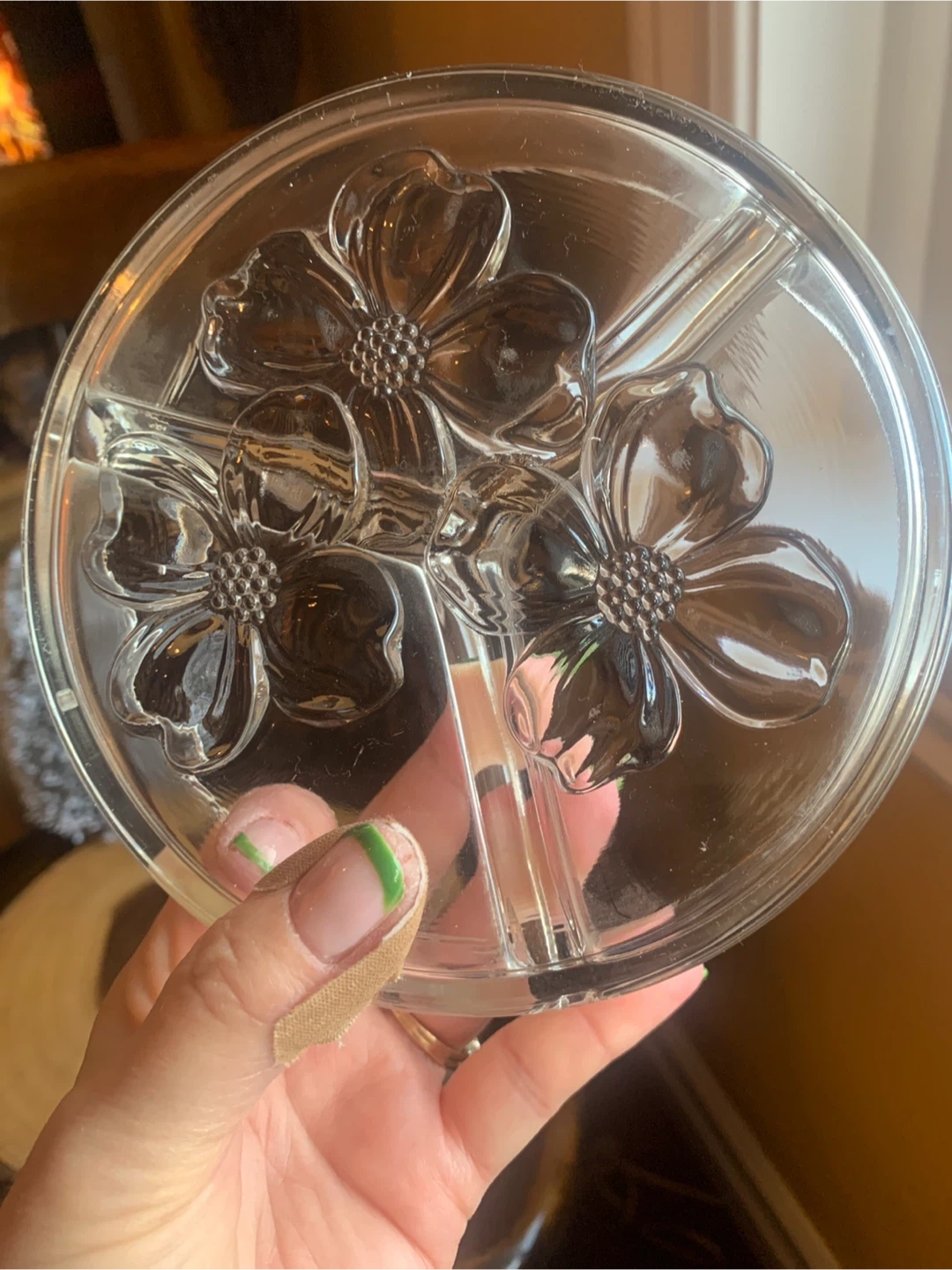 This clear vintage glass candy dish features a decorative lid with embossed pink dogwood flowers and a pretty textured glass knob. Made in the 1940’s-1950’s by Colony Glass. It's divided into three sections inside. The dogwood blossoms are embossed at the bottom as well. There are no chips or cracks. It's a pretty piece for serving treats, candies or displaying small items like jewelry!