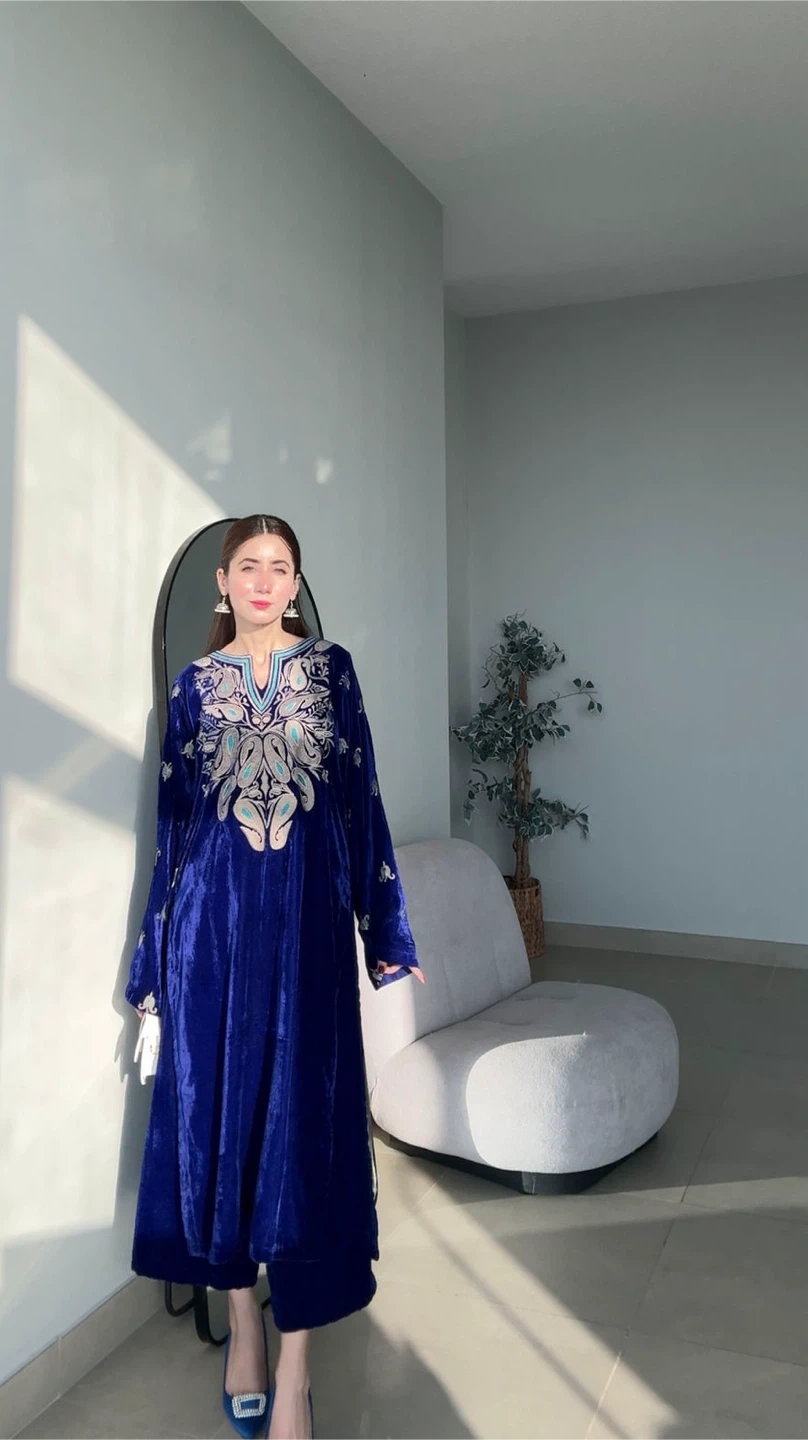 Beautiful blue velvet kurti with intricate silver and teal embroidery. It comes with matching pants. Made from soft velvet material.
