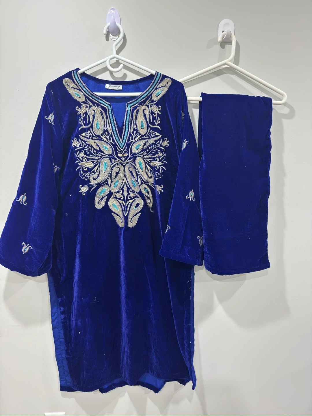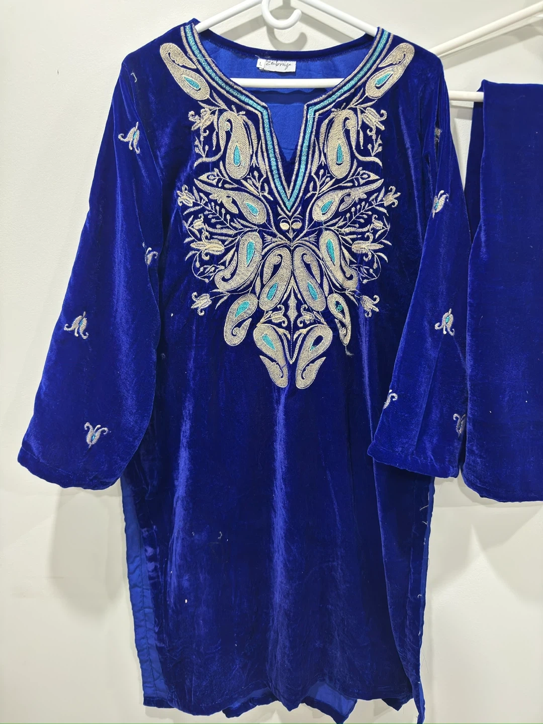 Beautiful blue velvet kurti with intricate silver and teal embroidery. It comes with matching pants. Made from soft velvet material.