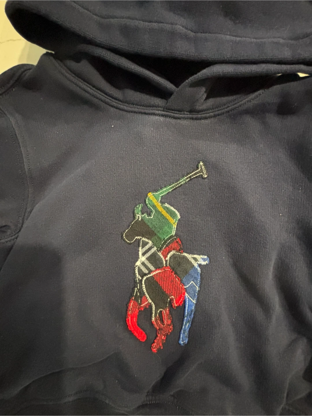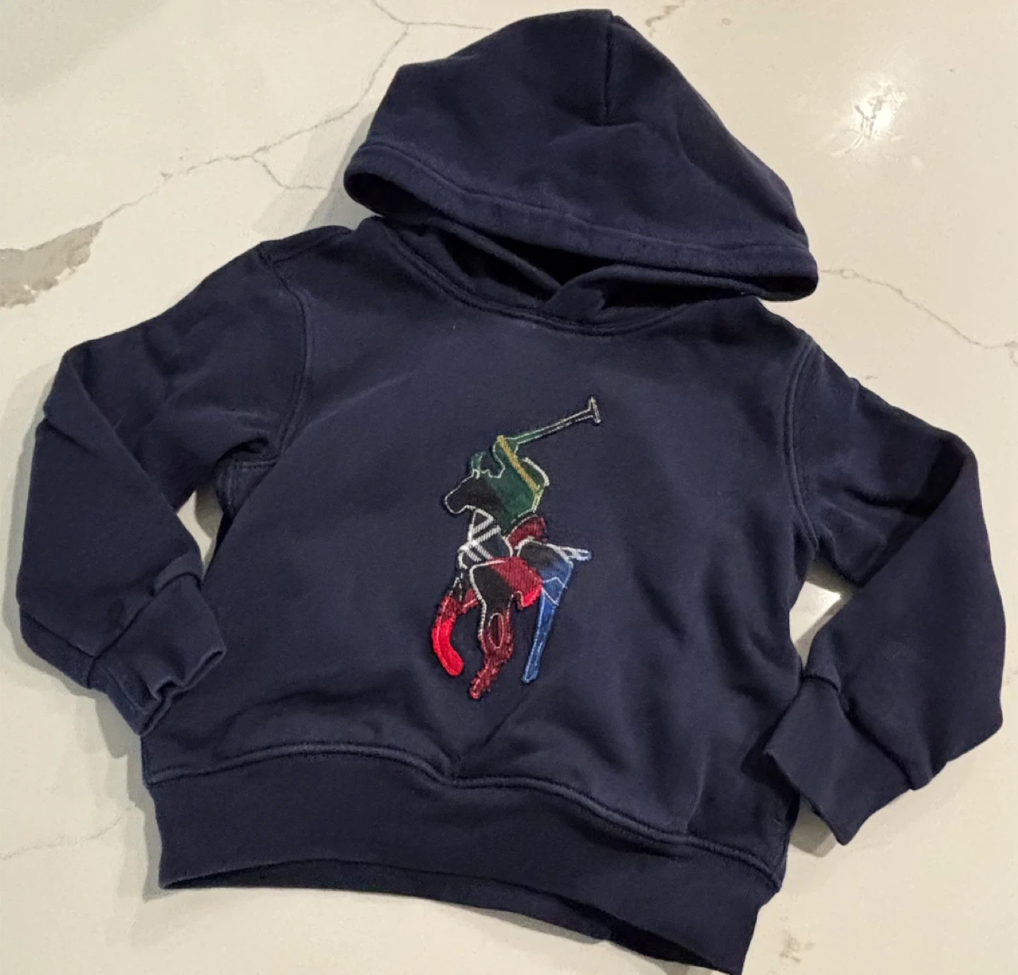 Navy blue Polo Ralph Lauren hoodie. Features the iconic multicolor Polo player logo. Size is 4. Cotton blend material. Excellent condition