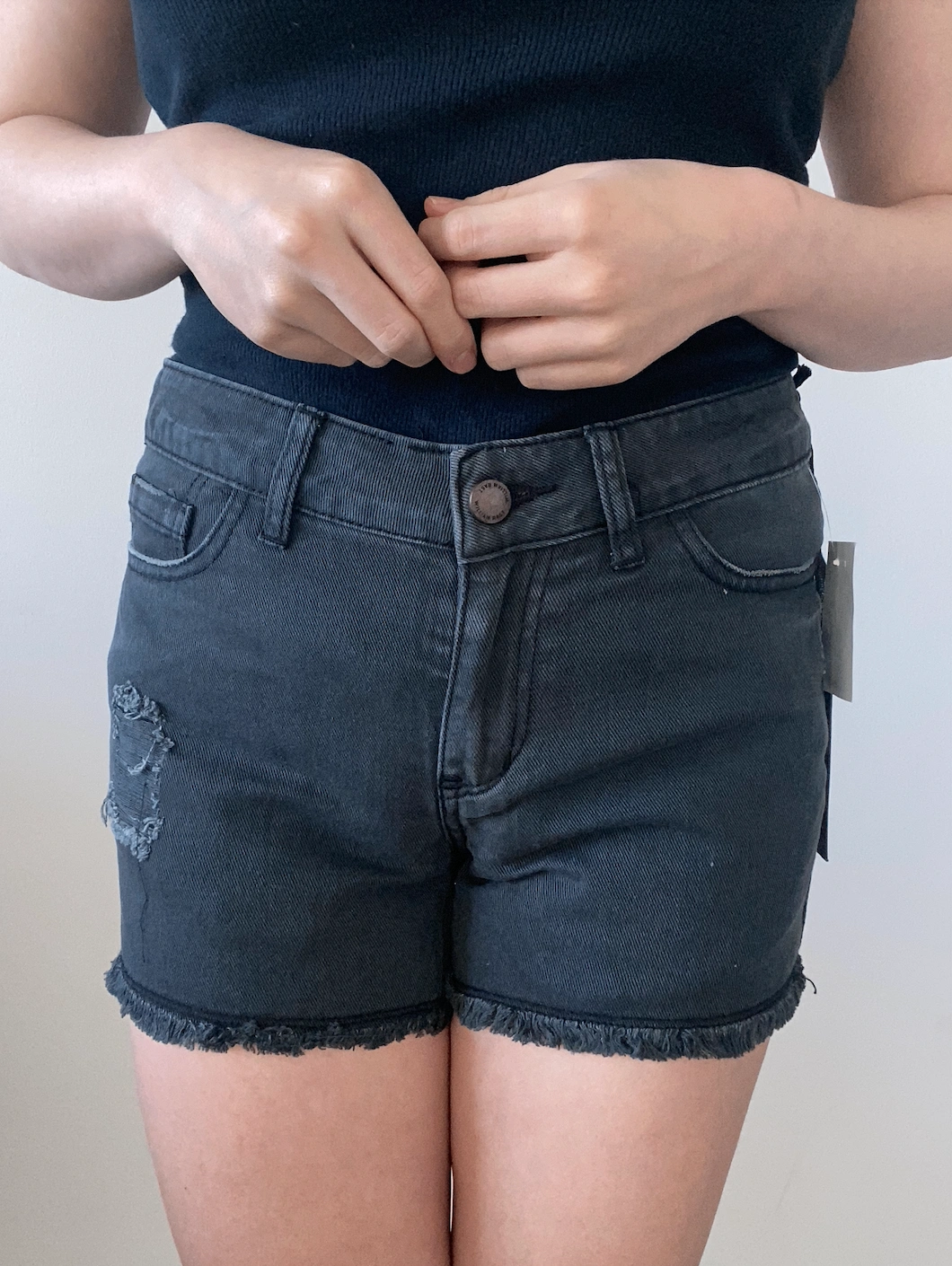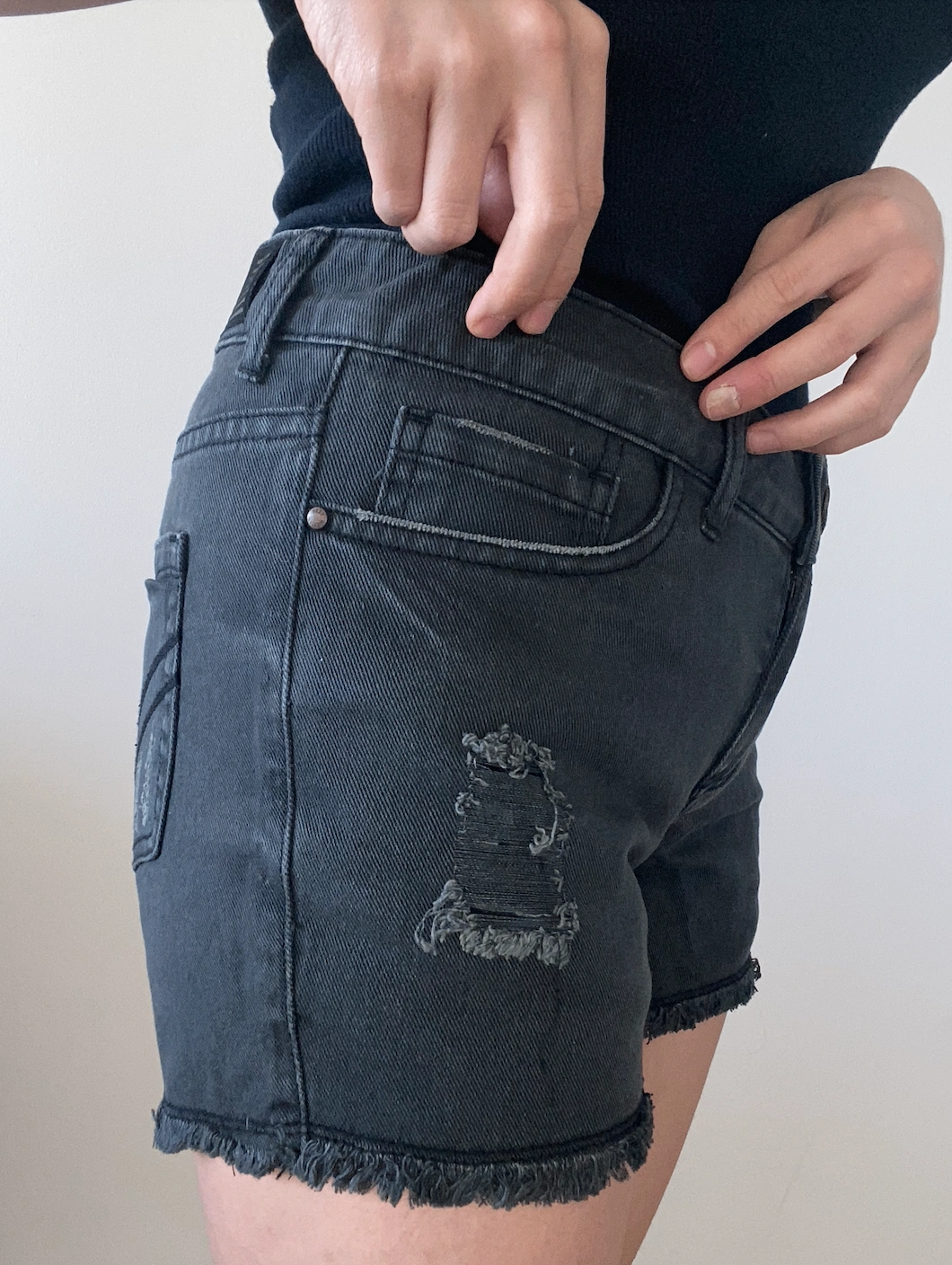 distressed black denim shorts