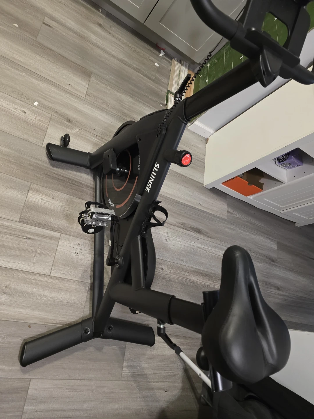 This is a SLUNSE brand stationary exercise bike. It's black and features adjustable seat and handlebars. The display shows scan, speed, time, distance, and calories. Includes a water bottle holder.