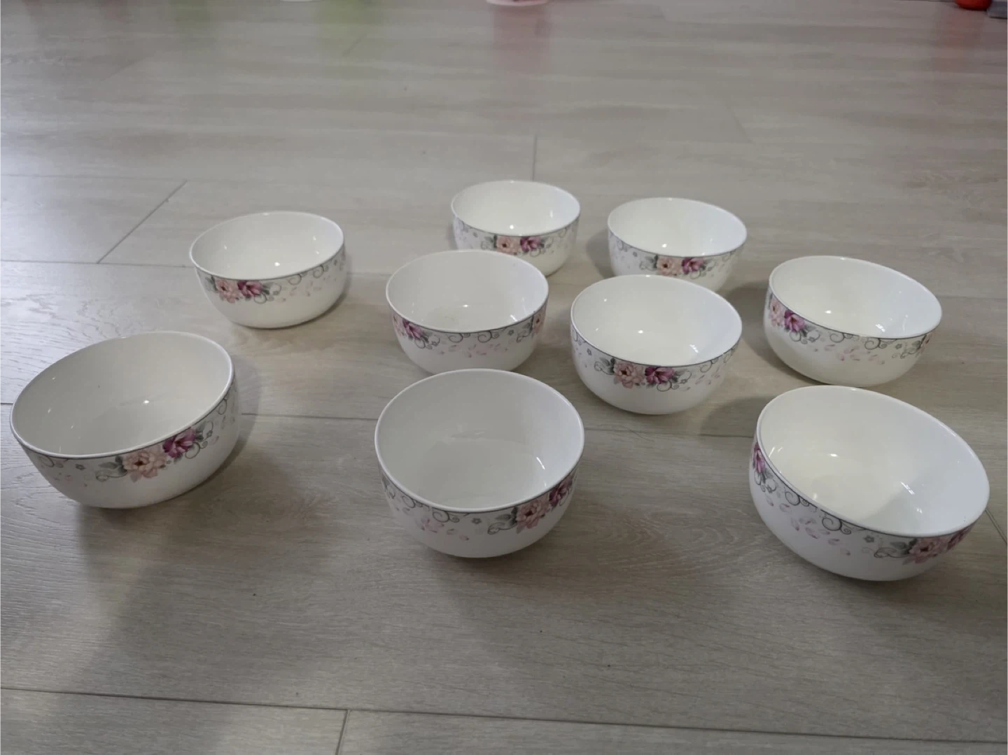 This is a set of Nine white ceramic bowls. They feature a delicate floral pattern around the rim. Perfect for serving snacks, desserts, or individual portions.