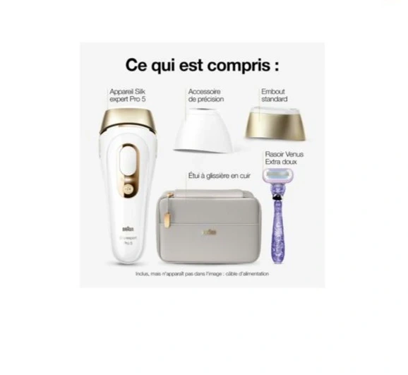 This Brand new Braun Silk Expert Pro 5 is a permanent hair removal device. It includes the main unit, a Venus razor, a travel pouch, and its charging cable. It's designed for efficient hair reduction at home.