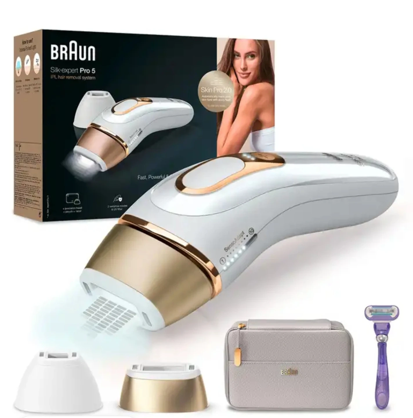 This Brand new Braun Silk Expert Pro 5 is a permanent hair removal device. It includes the main unit, a Venus razor, a travel pouch, and its charging cable. It's designed for efficient hair reduction at home.