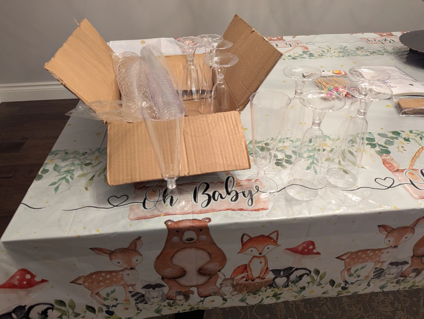 Complete set for a "Oh Baby" themed celebration! Includes "BABY" blocks,cupcake holder, champagne flutes, and party game accessories. Great for creating a festive atmosphere!