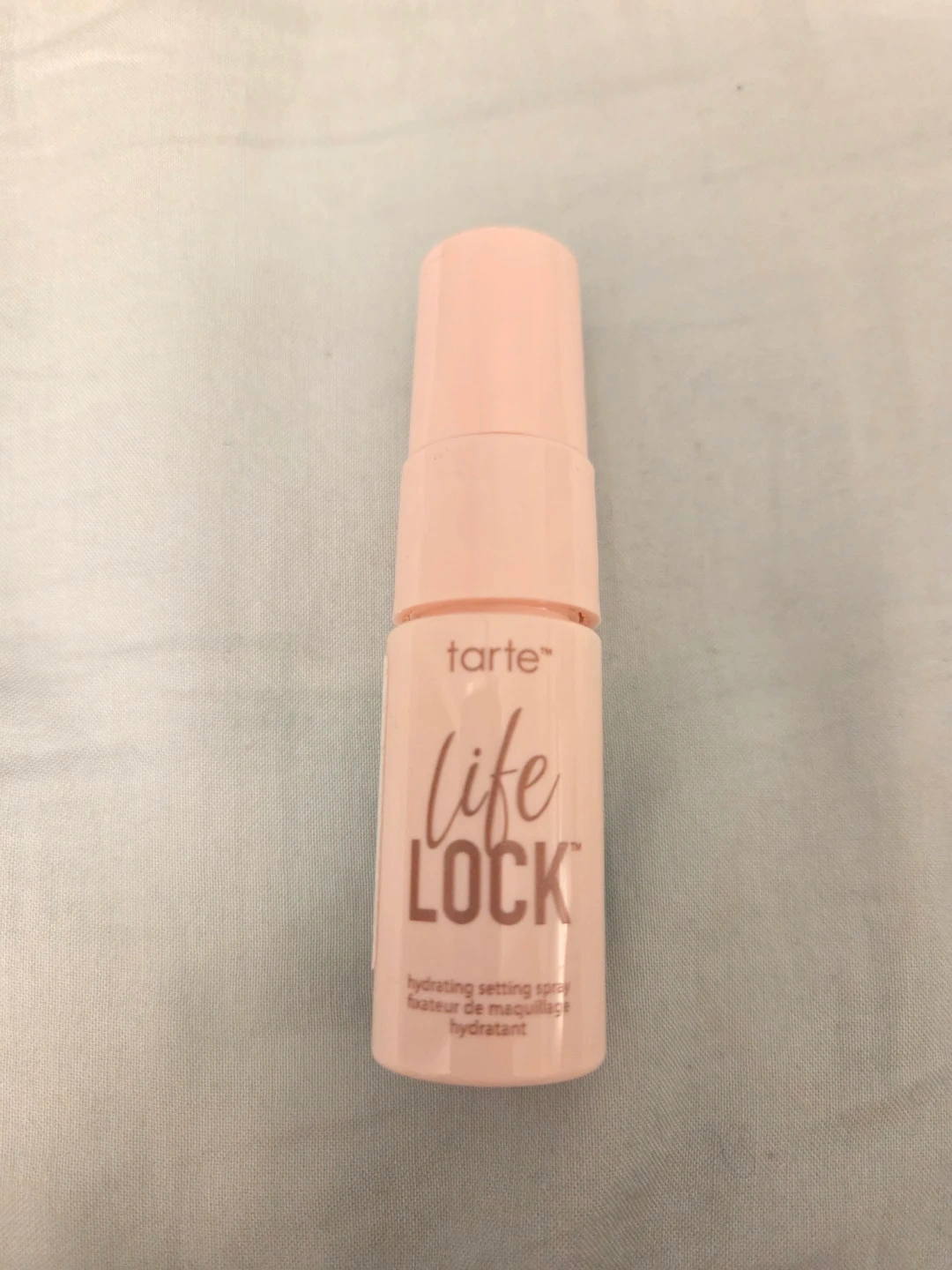 Tarte Life Lock hydrating setting spray. It's a fixing spray for makeup. Helps hydrate the skin. 8 ml/ 0.27 fl oz.