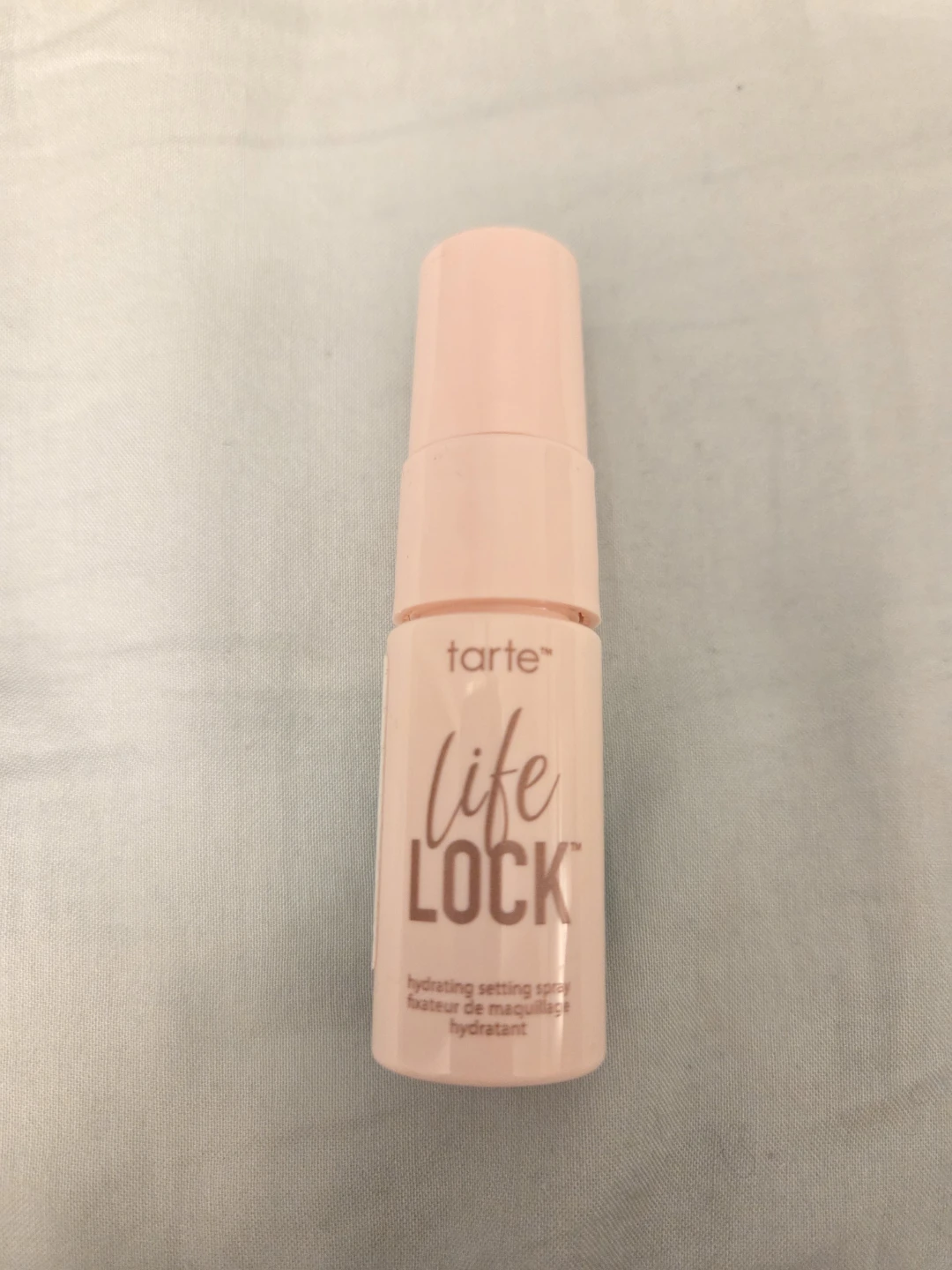 Tarte Life Lock hydrating setting spray. It's a fixing spray for makeup. Helps hydrate the skin. 8 ml/ 0.27 fl oz.