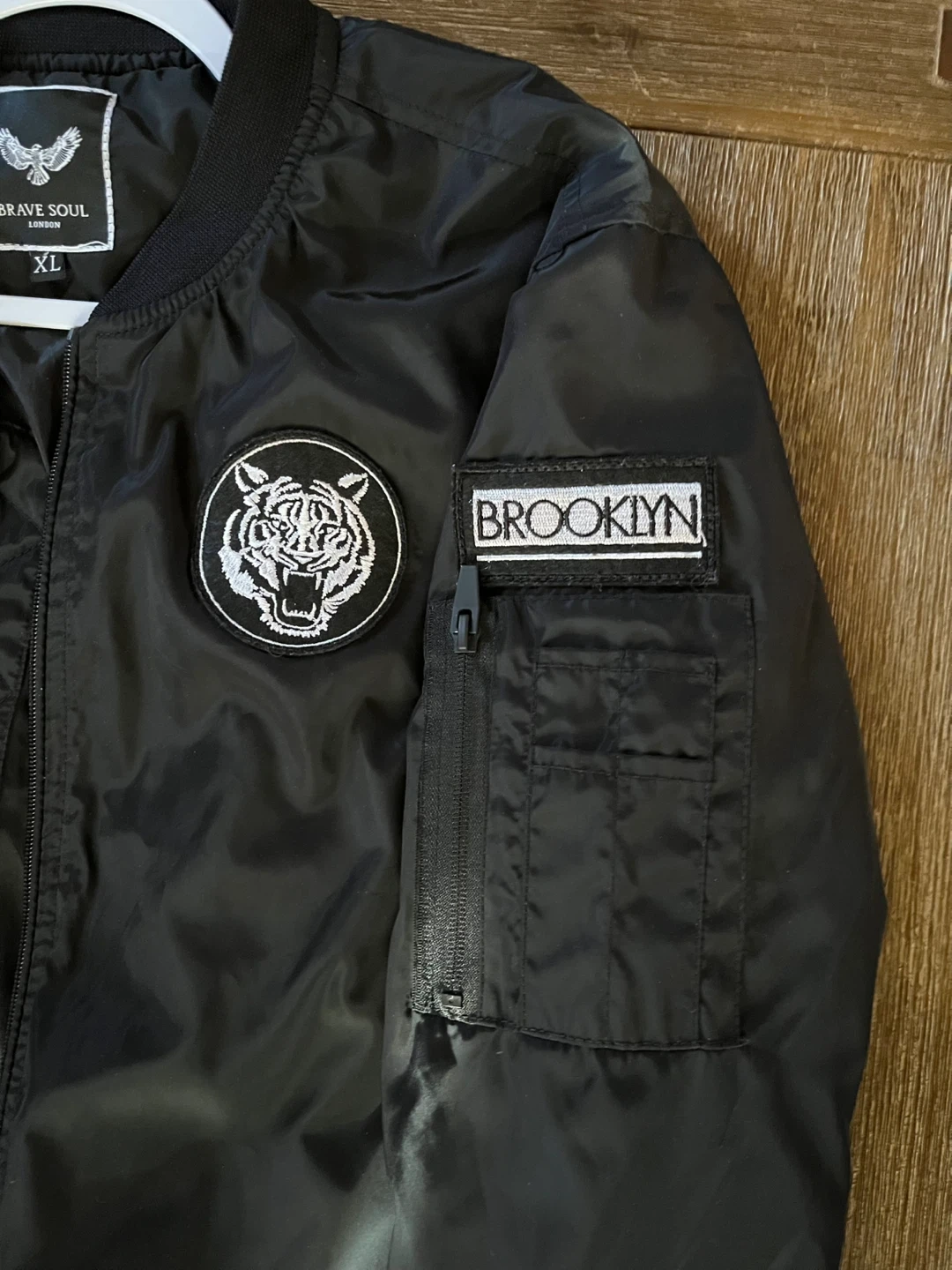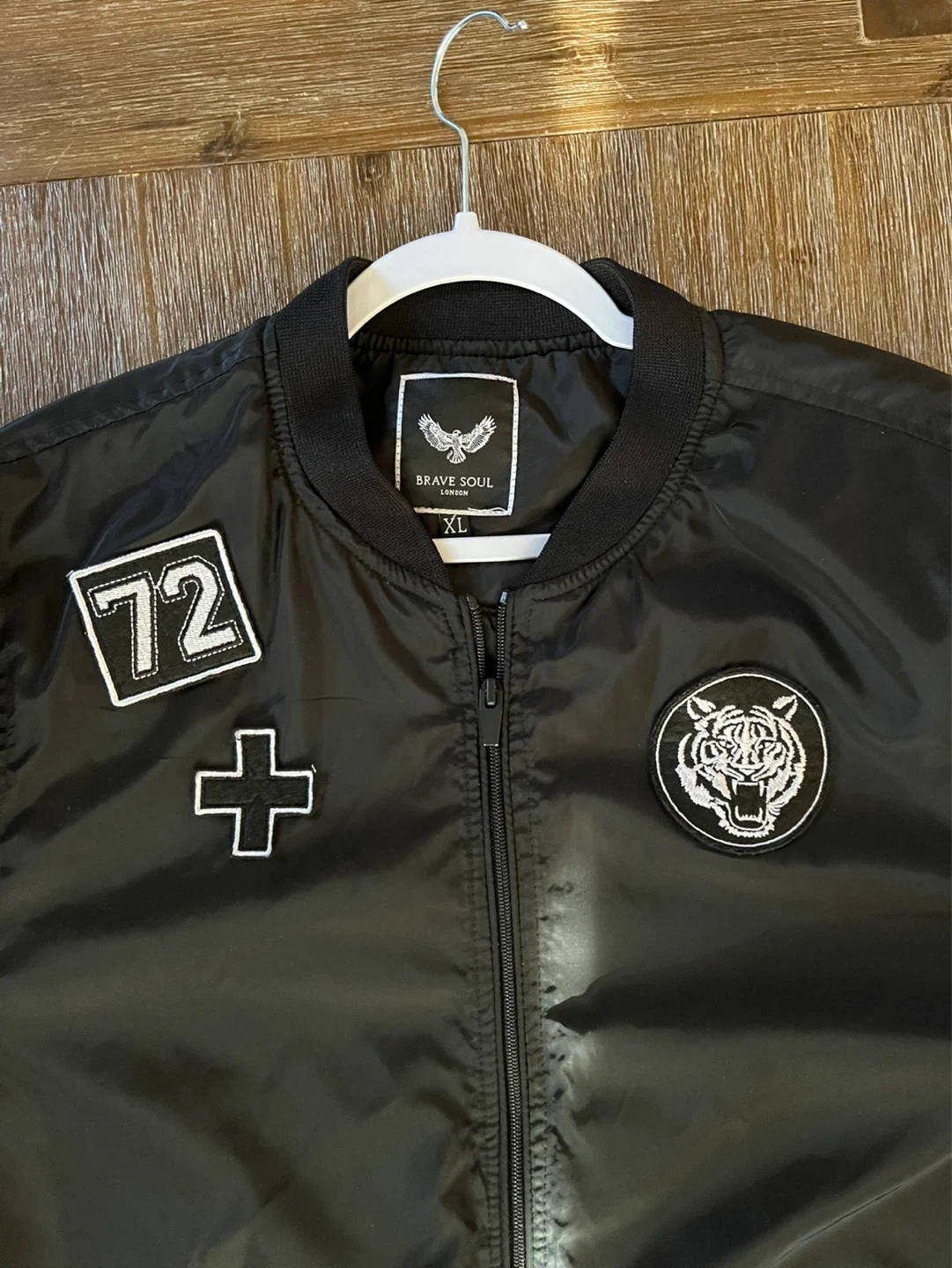 Cool black bomber jacket from Brave Soul London. XL size. Has a bunch of unique patches like '72', a tiger head, 'BROOKLYN', and a diamond. Zipper closure and ribbed cuffs/collar. Super comfy.