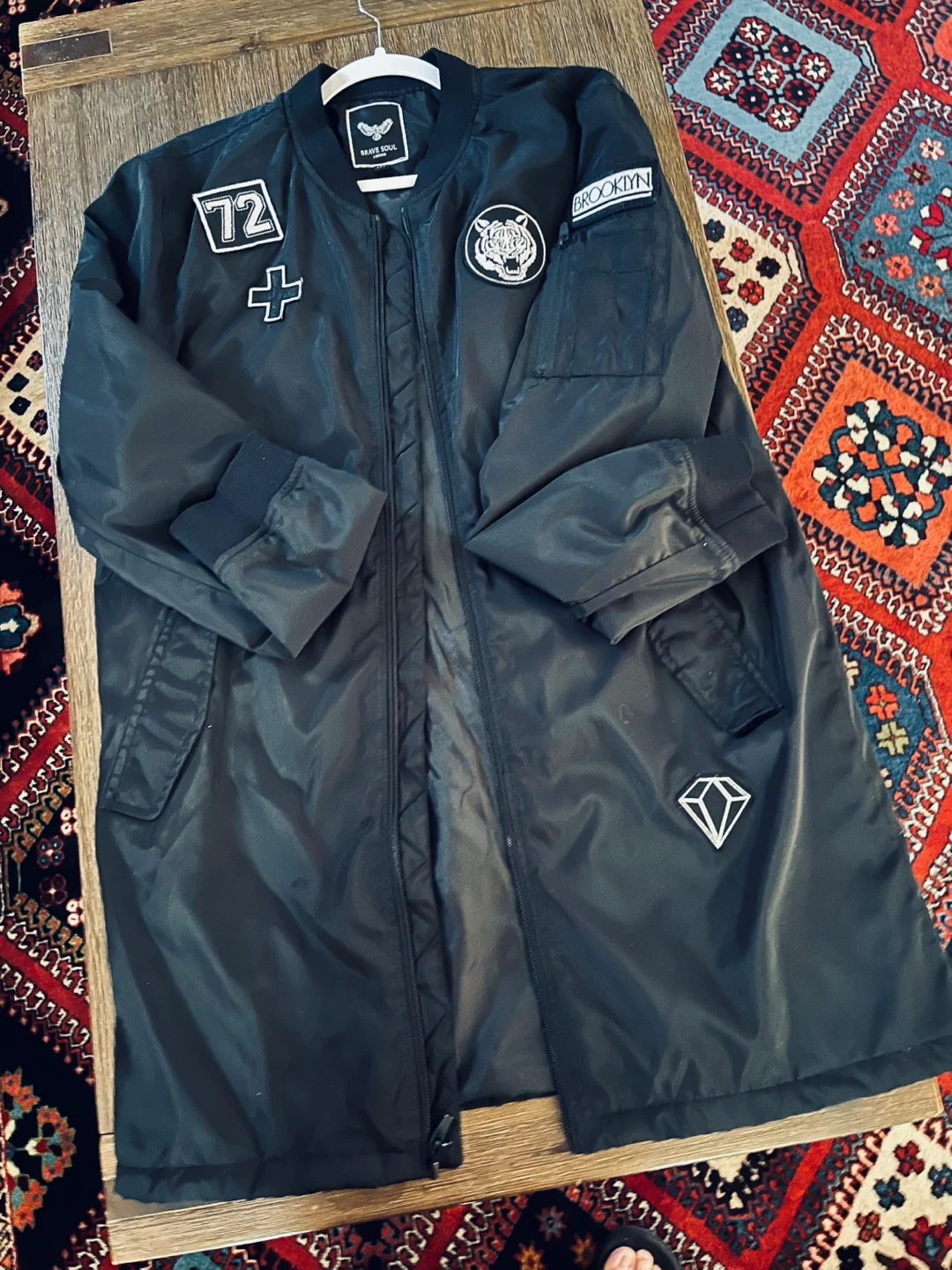 Cool black bomber jacket from Brave Soul London. XL size. Has a bunch of unique patches like '72', a tiger head, 'BROOKLYN', and a diamond. Zipper closure and ribbed cuffs/collar. Super comfy.