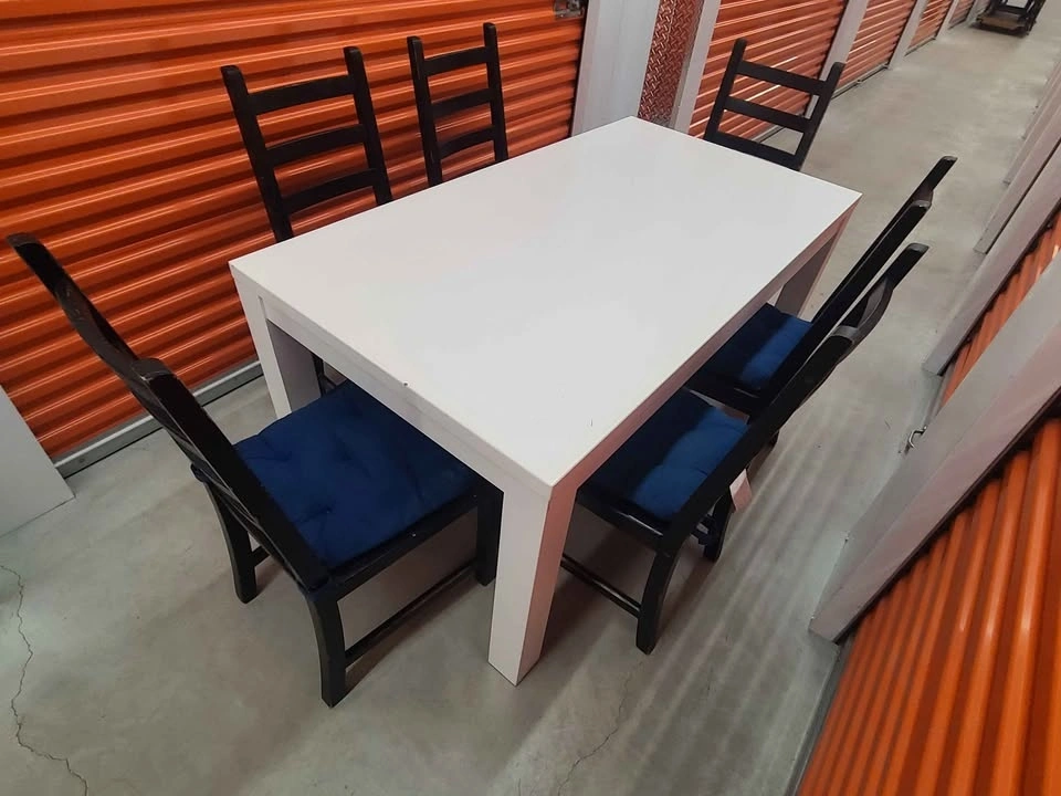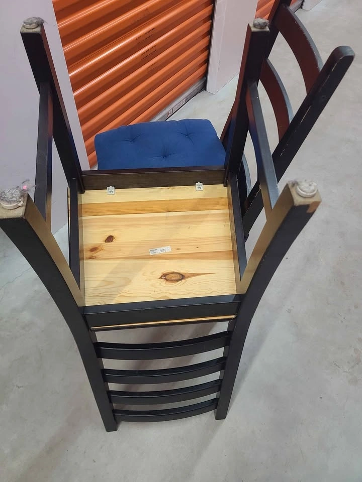 Solid wood table (36" x 65") and 6 Ikea wooden chairs. Comes with cushions. Good used condition, has some marks, chips, scratches, and peeling, but fully functional, nothing broken.