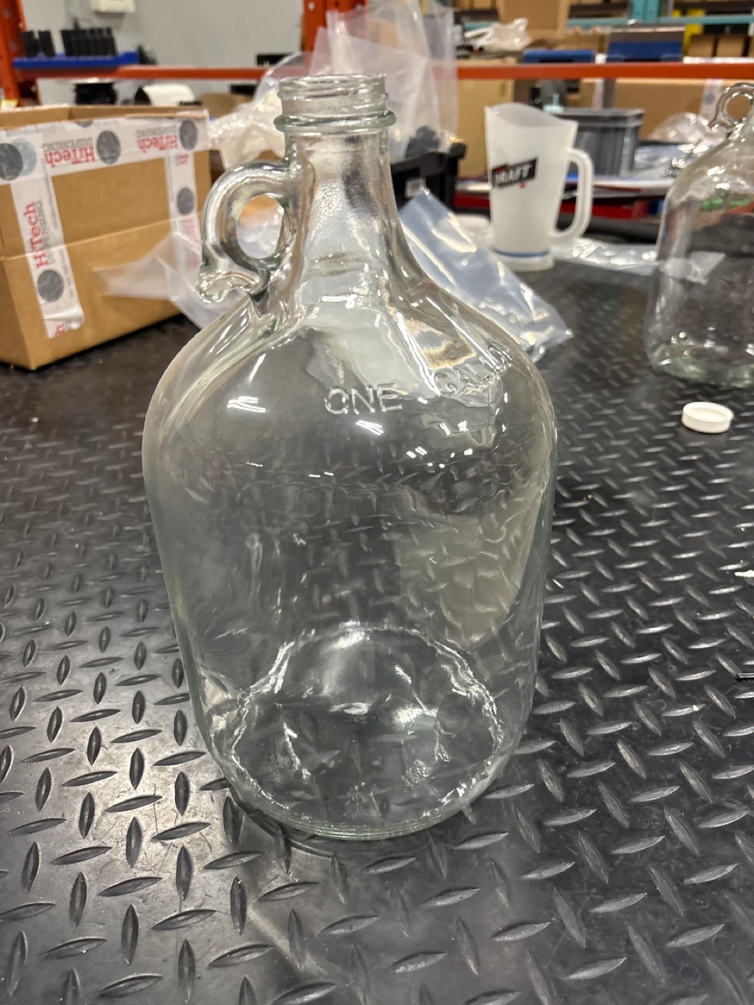 This is a one-gallon glass jug. It's made of clear glass and has a handle for easy carrying. Great for home brewing or storing liquids!