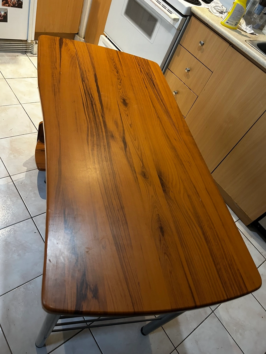 Selling a desk table with a nice wood grain finish. It has a unique design with a shelf underneath the tabletop. The legs are metal. It's in good condition and would be a great addition to any study space.