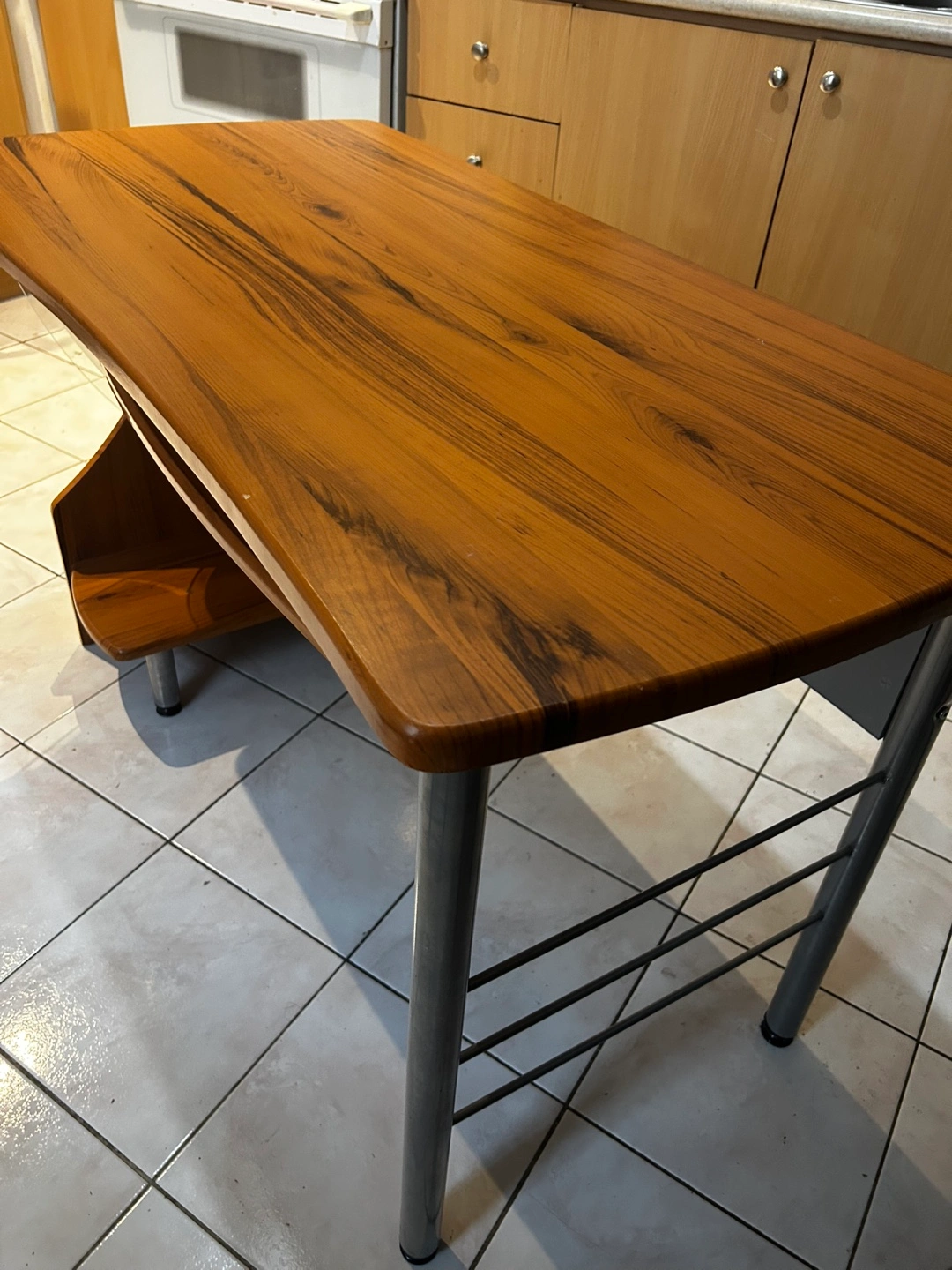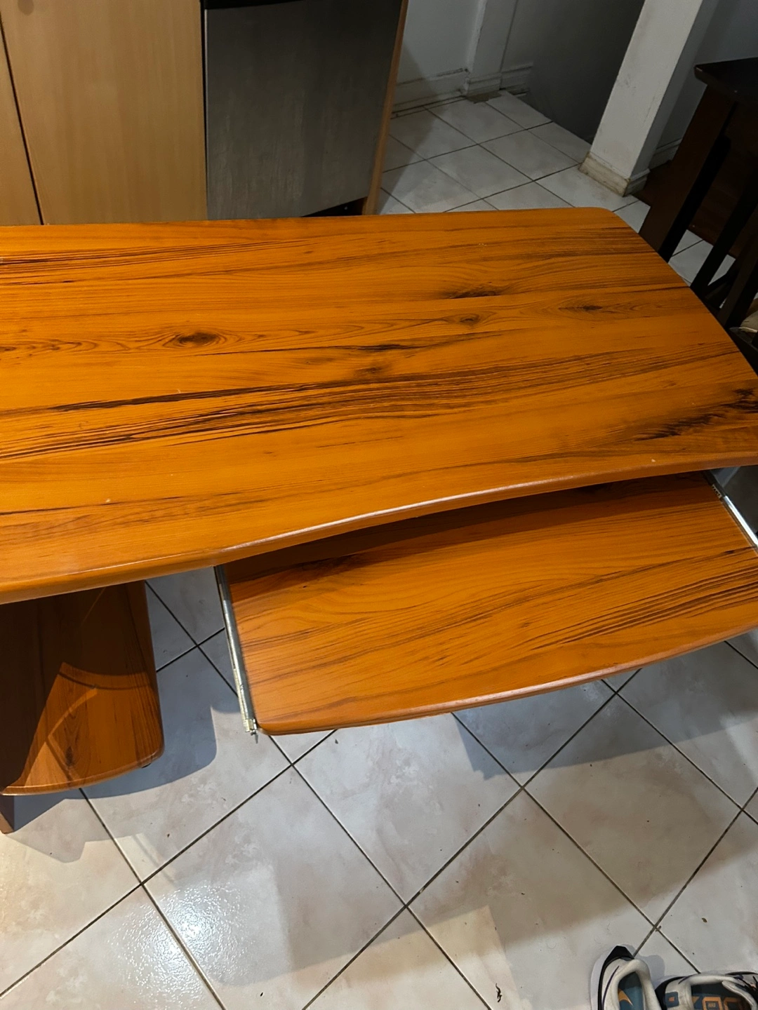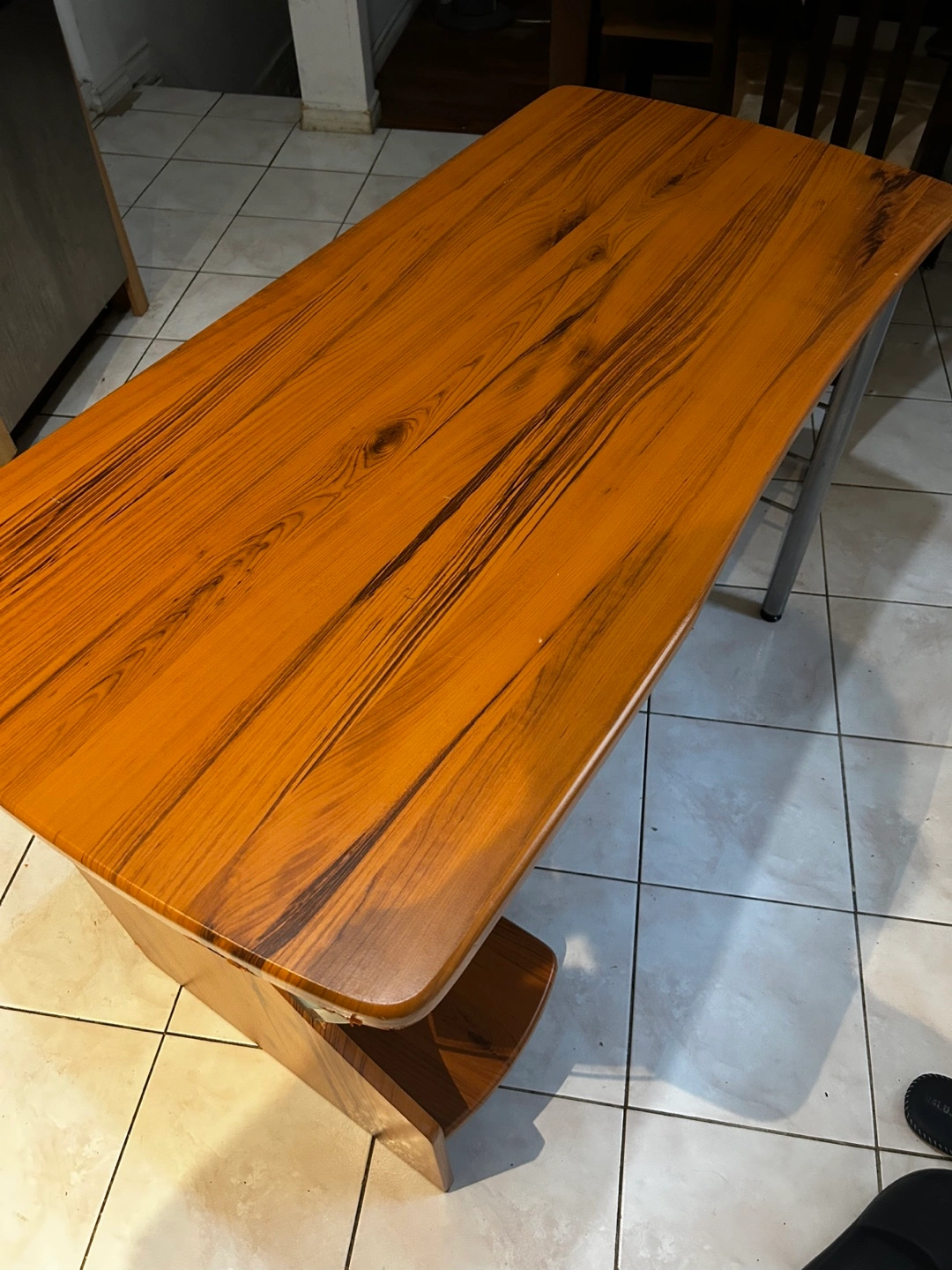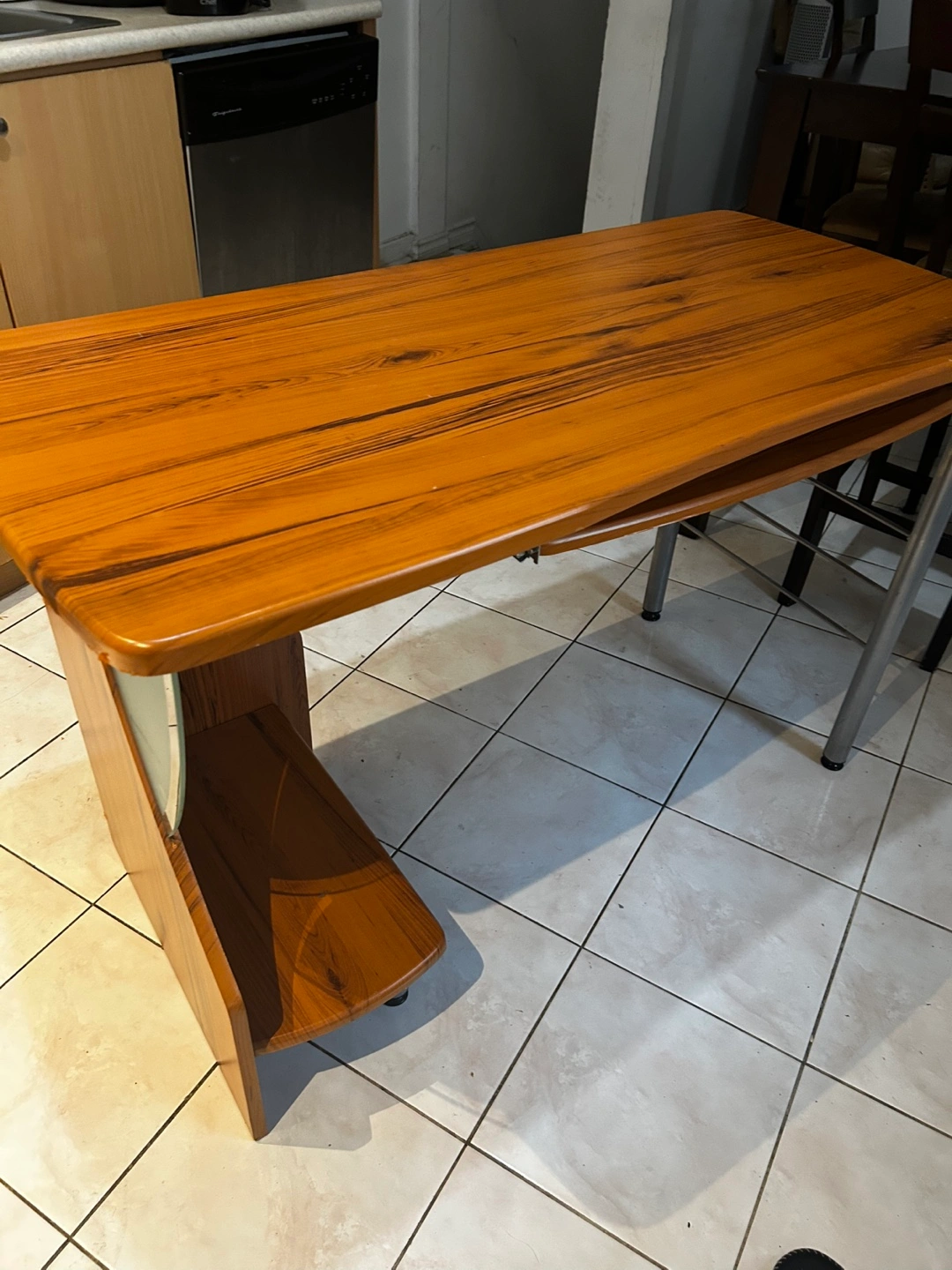 Selling a desk table with a nice wood grain finish. It has a unique design with a shelf underneath the tabletop. The legs are metal. It's in good condition and would be a great addition to any study space.
