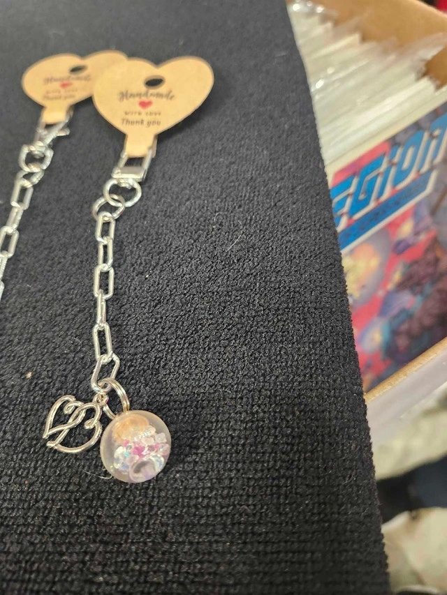 This is a handmade bracelet with silver chain links, a heart charm, and a glass globe filled with iridescent flakes, adding a whimsical touch to any outfit. The bracelet is in used - like new condition. Looking to add a unique piece to your jewellery collection? This handmade bracelet brings a sparkle to your wrist without breaking the bank. It’s like finding a little treasure, isn't it? If the ad is still up, yes, it's still available!