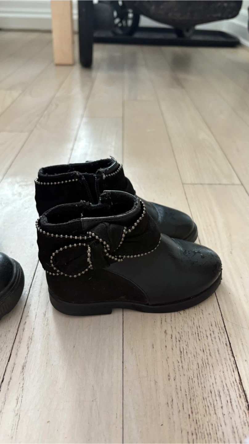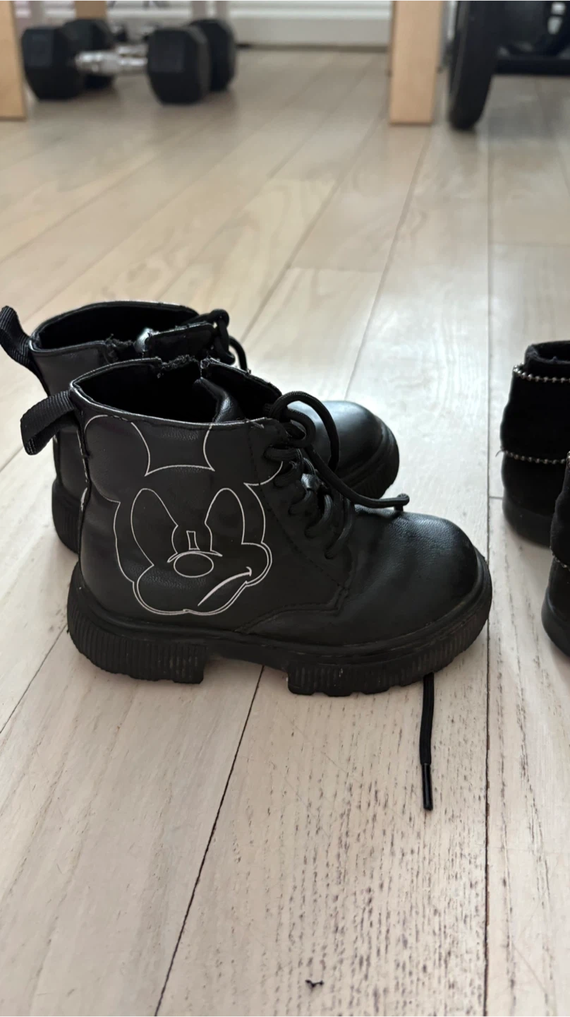 Cute black LEATHER ankle boots featuring a Mickey Mouse design. These boots have zippers for easy on and off. size 22 or 4/5 for toddler children.