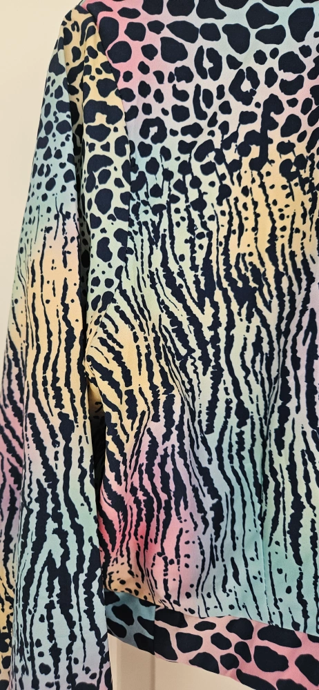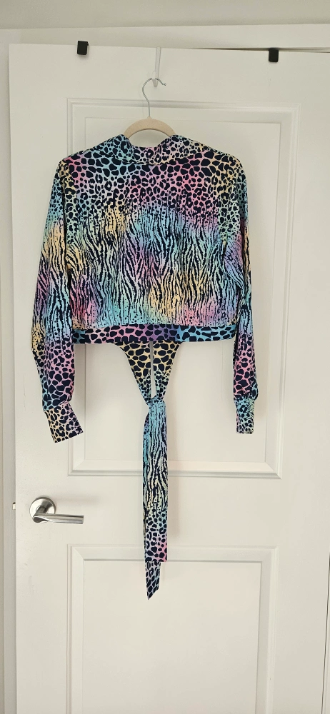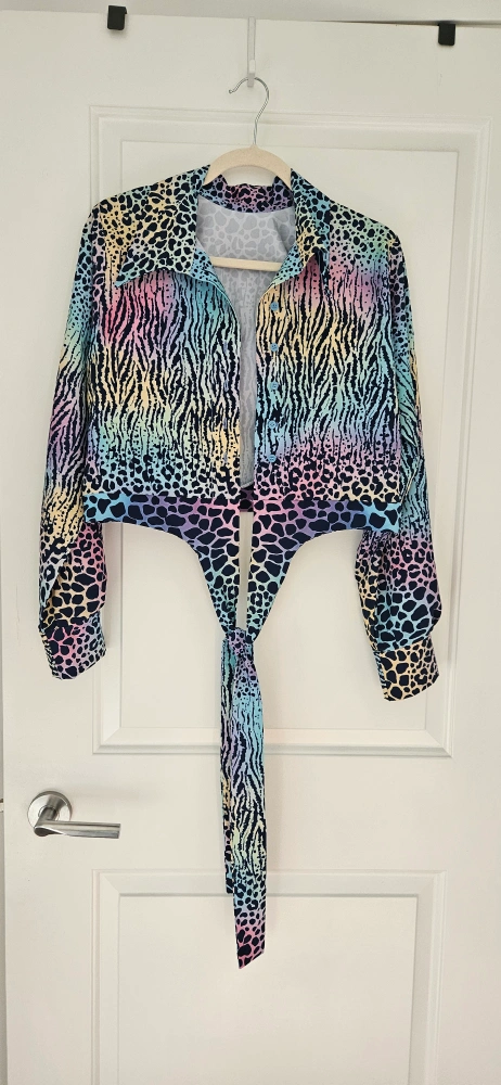 Fun and funky animal print tie front top! Size Medium. This top features a unique blend of zebra and leopard prints in a cool rainbow gradient. Perfect for adding a pop of colour to your wardrobe.