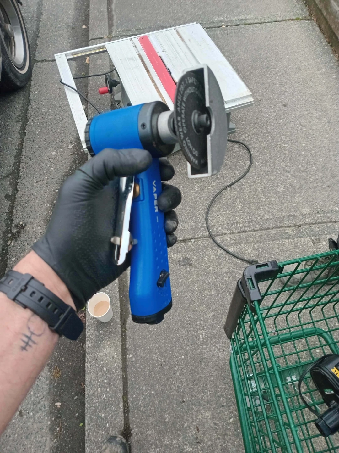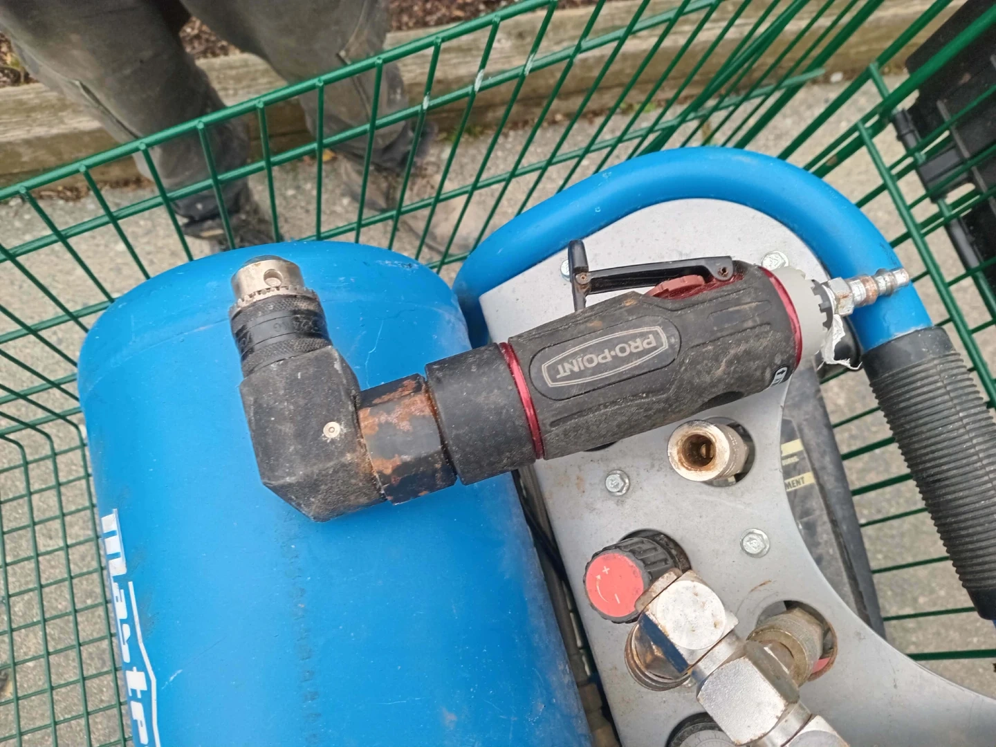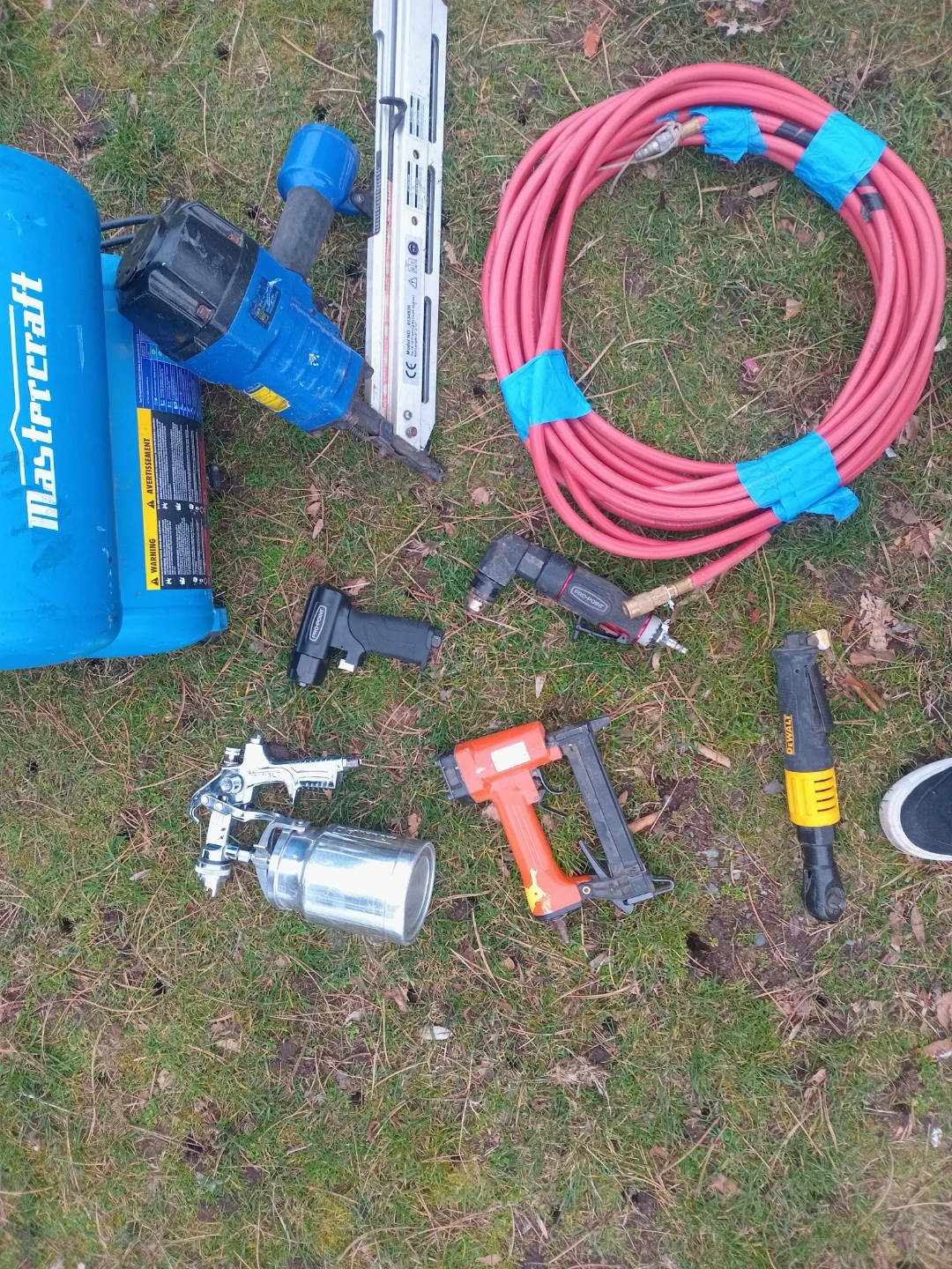 This set includes a Mastercraft air compressor, a nail gun, a spray gun, and an angle grinder. It also comes with an air hose and a smaller stapler. Everything you need for your next project!