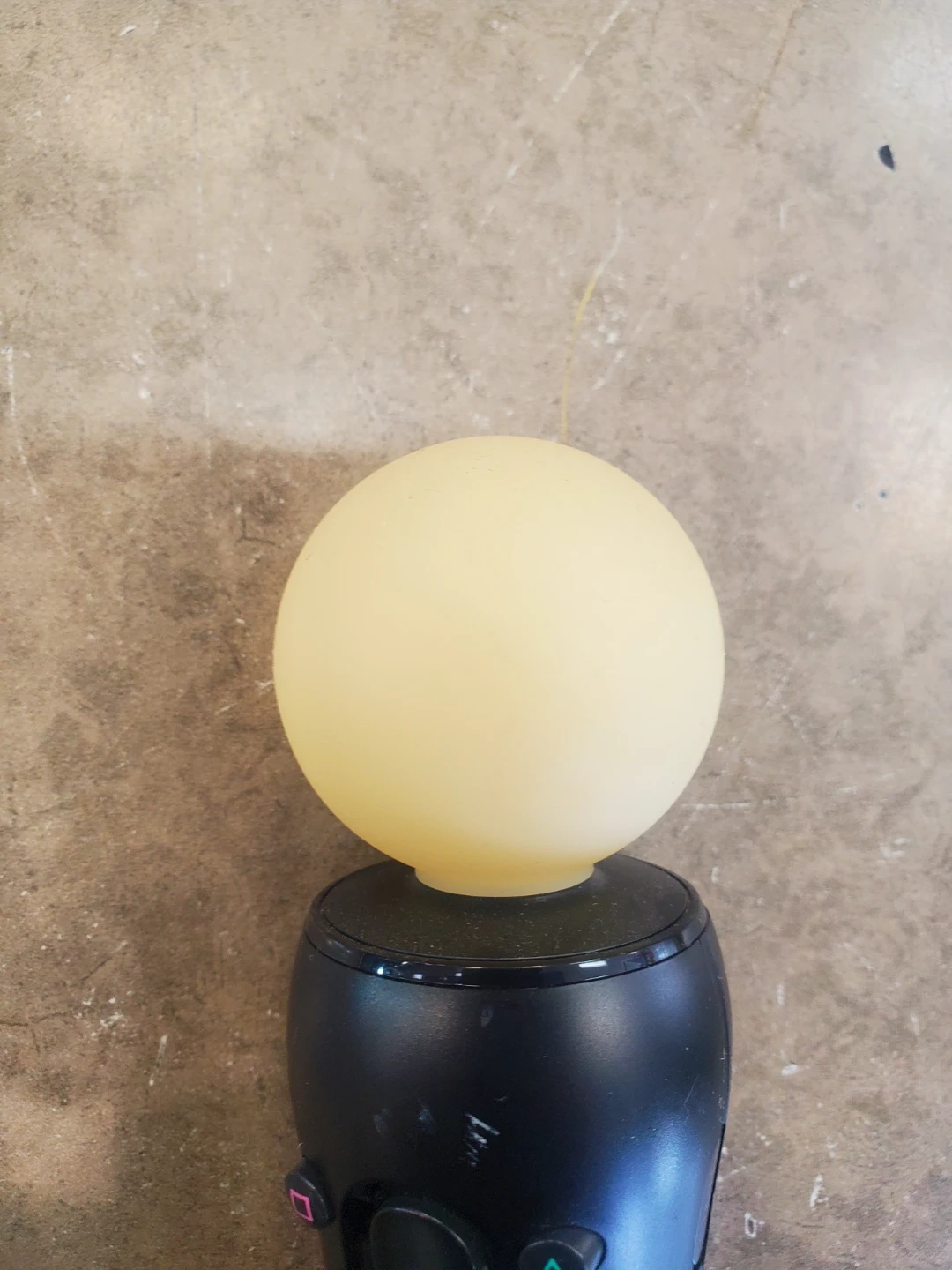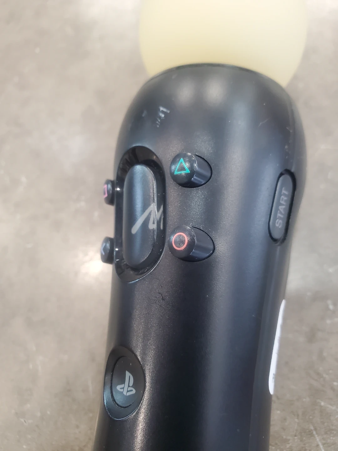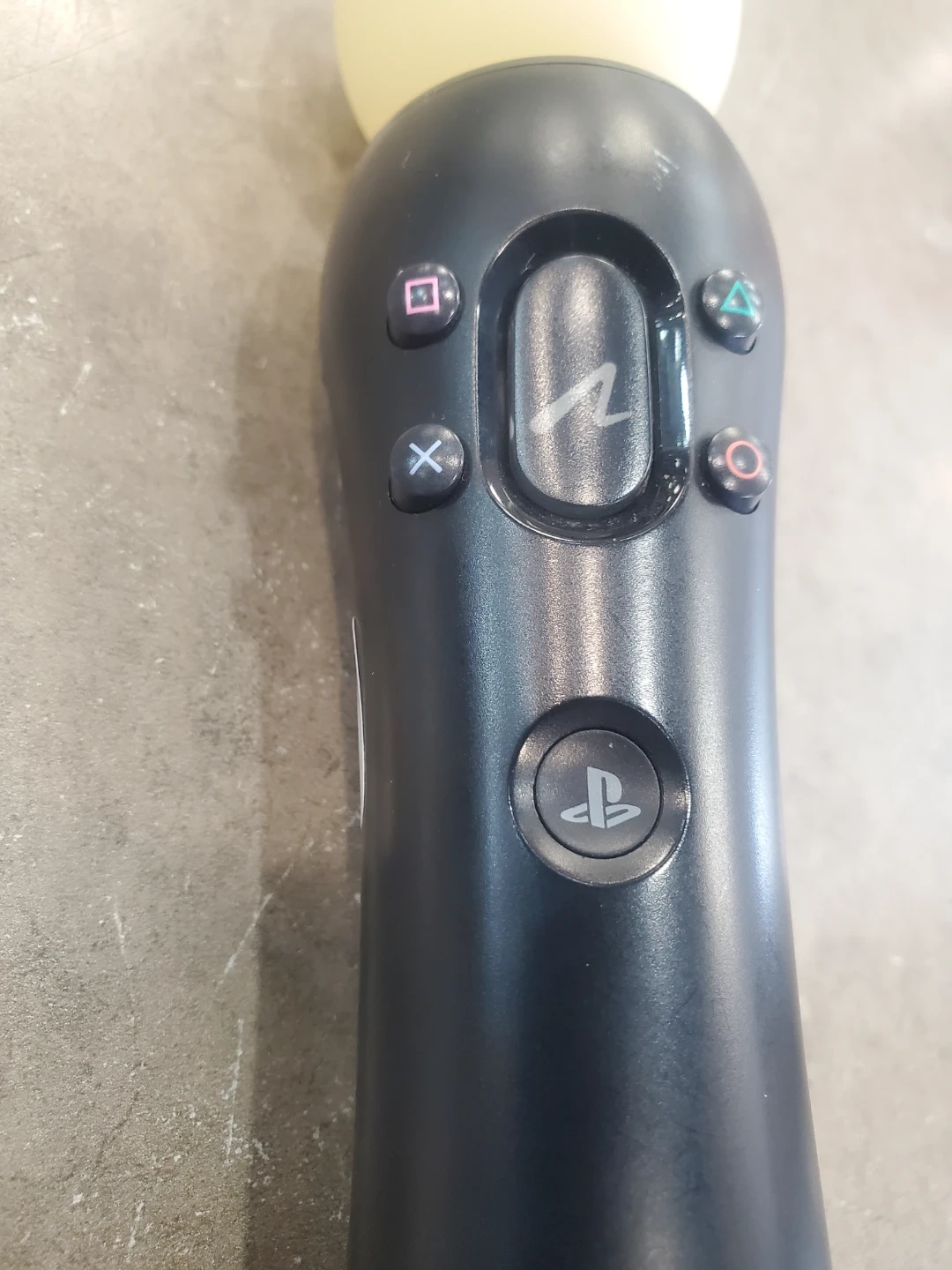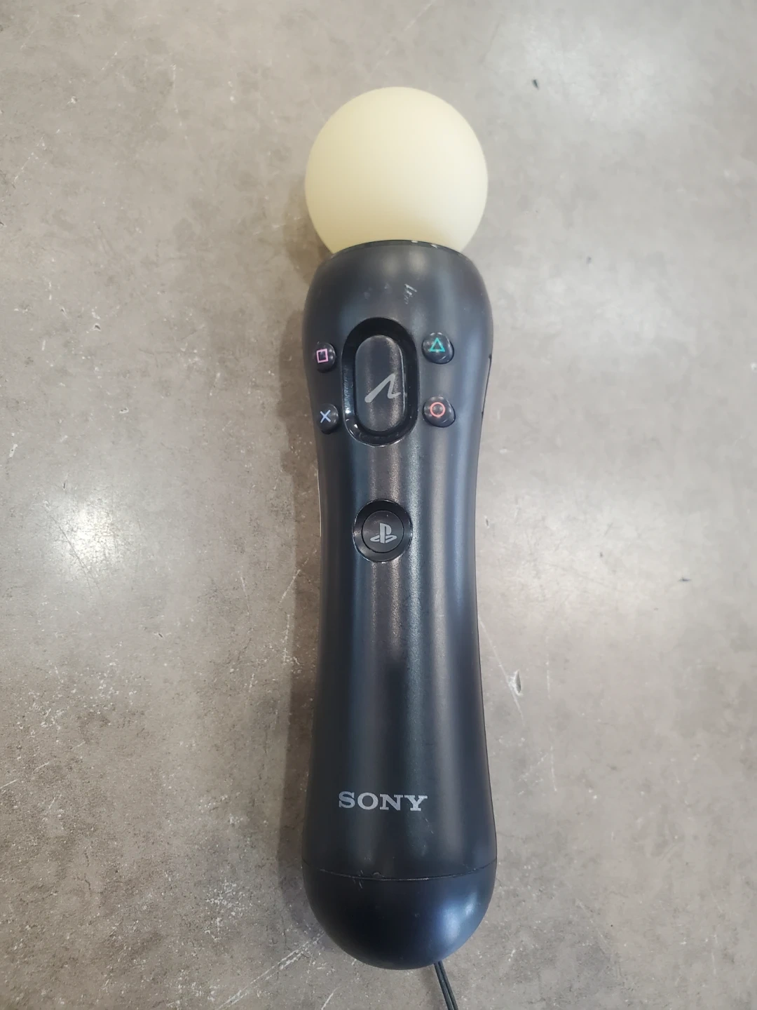 This is a black Sony PlayStation Move motion controller. It's compatible with PlayStation consoles. Features standard PlayStation buttons and a light-up orb at the top.