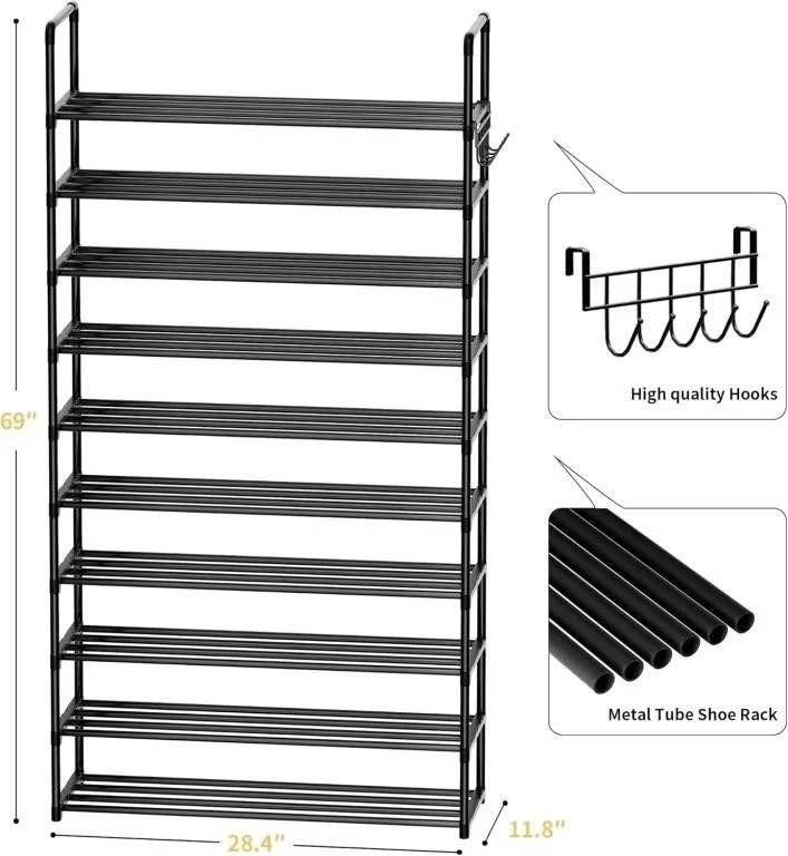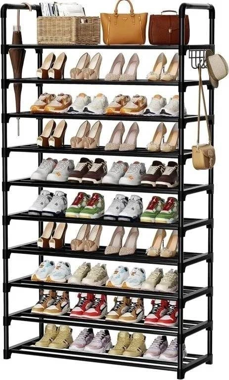 Shoe Rack, 10 Tier with Hooks, Fit 40-45 Pairs Shoes, Metal Tall