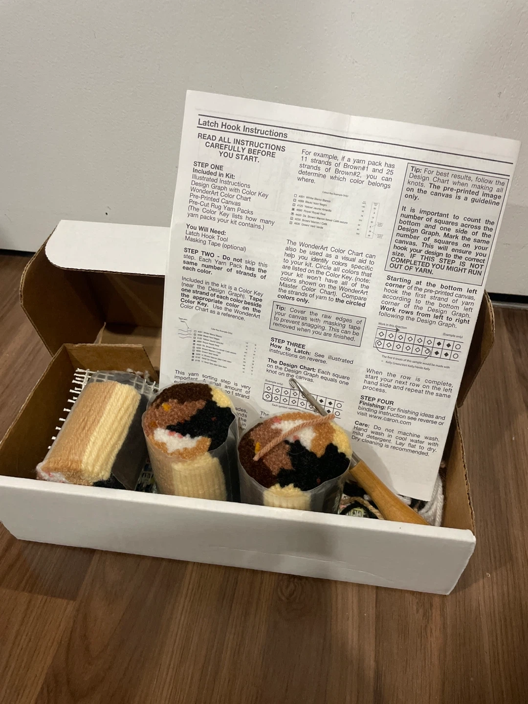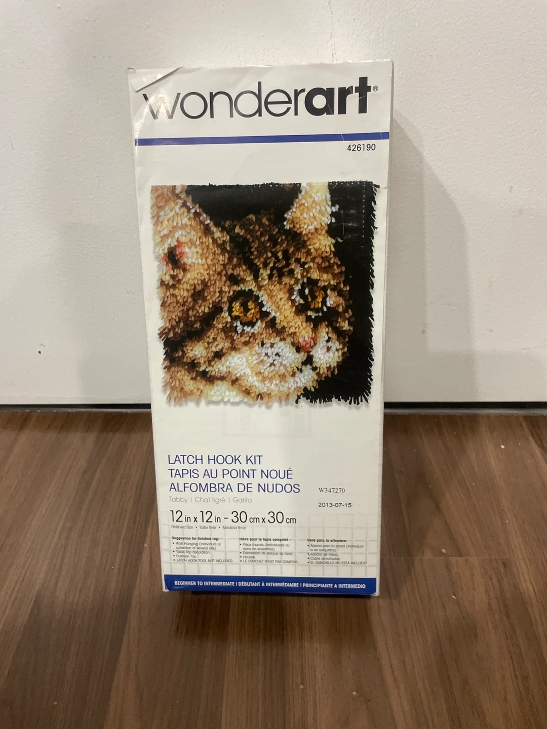 This is a Wonderart latch hook kit for creating a cat design. The finished rug size is 12" x 12" or 30 cm x 30 cm. It includes a canvas, latch hook tool, and yarn packs. This kit is suitable for beginners to intermediate crafters.